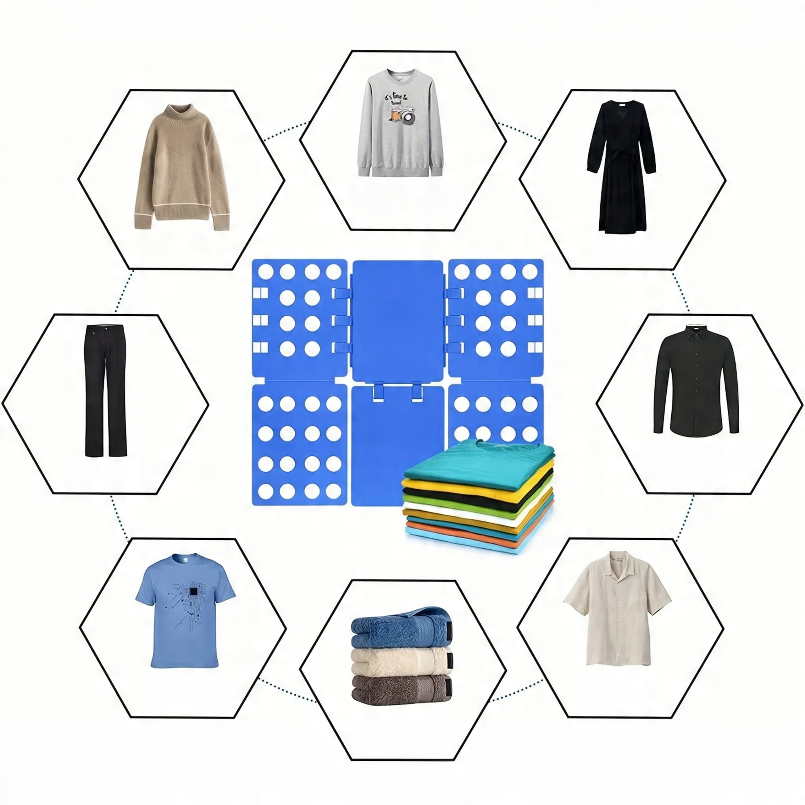 Облегчите свои ежедневные домашние обязанности благодаря практической и большой доске за то, что он положил одежду. Это простой, но чрезвычайно эффективный инструмент поможет вам быстро и равномерно собрать T -рубашки, толстовки, брюки и другие предметы гардероба - как в профессиональном магазине одежды!