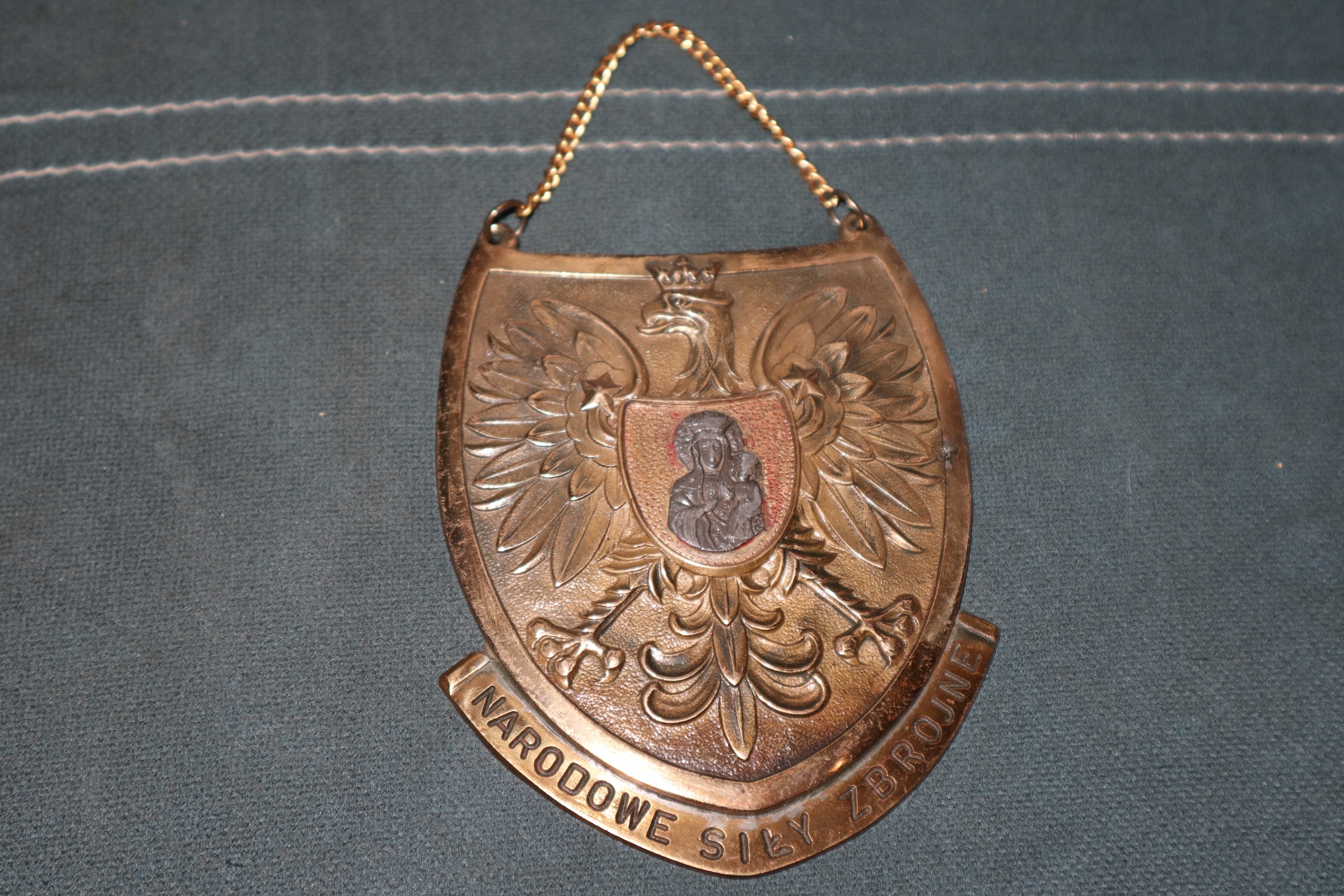 Большие медные национальные вооруженные силы 12,5 см, ширина 10,5 см, вес 308 g. Обратите внимание на обратном направлении, чтобы удалить фрагмент немного пластитина. Состояние, как на фото