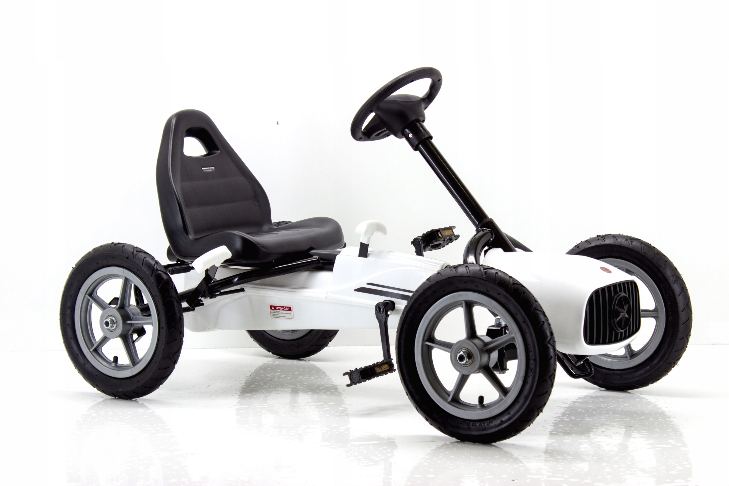 Педали с противоскользящим покрытием обеспечивают удобное использование картинга даже после дождя. Красивый большой руль облегчает управление картингом и доставляет удовольствие.