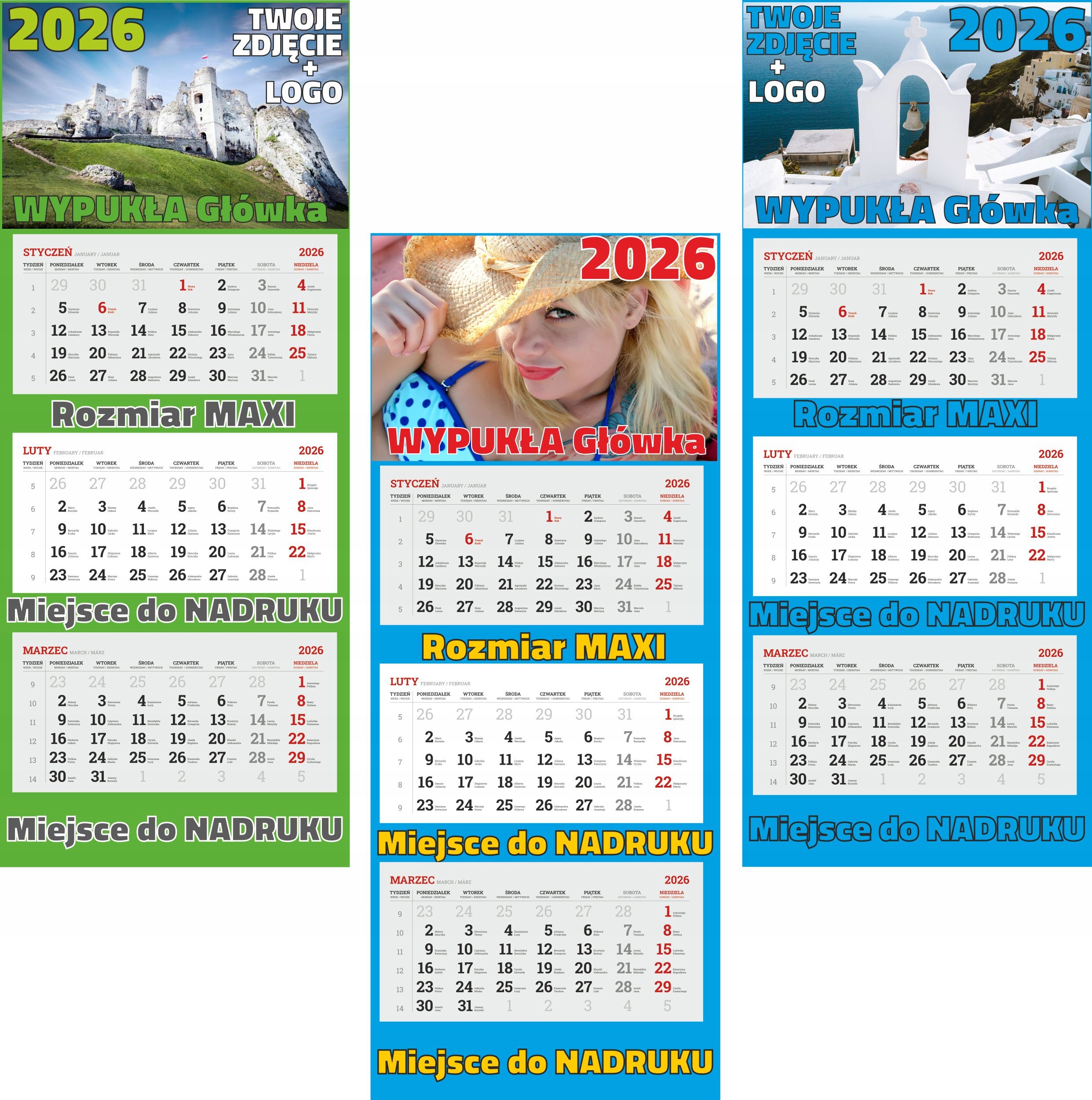 Большие тройничные календари 2026 с выпуклой головкой с печати - 50 штук