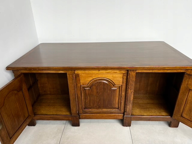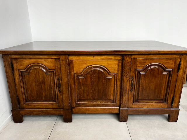 Двустороннее бурко из древесины дуба. Крепкий, массивный, большой. Он имеет нормальные признаки использования. Состояние стола подробно показано на фотографиях. Замки рабочие, в комплекте три ключа. Готов к размещению.