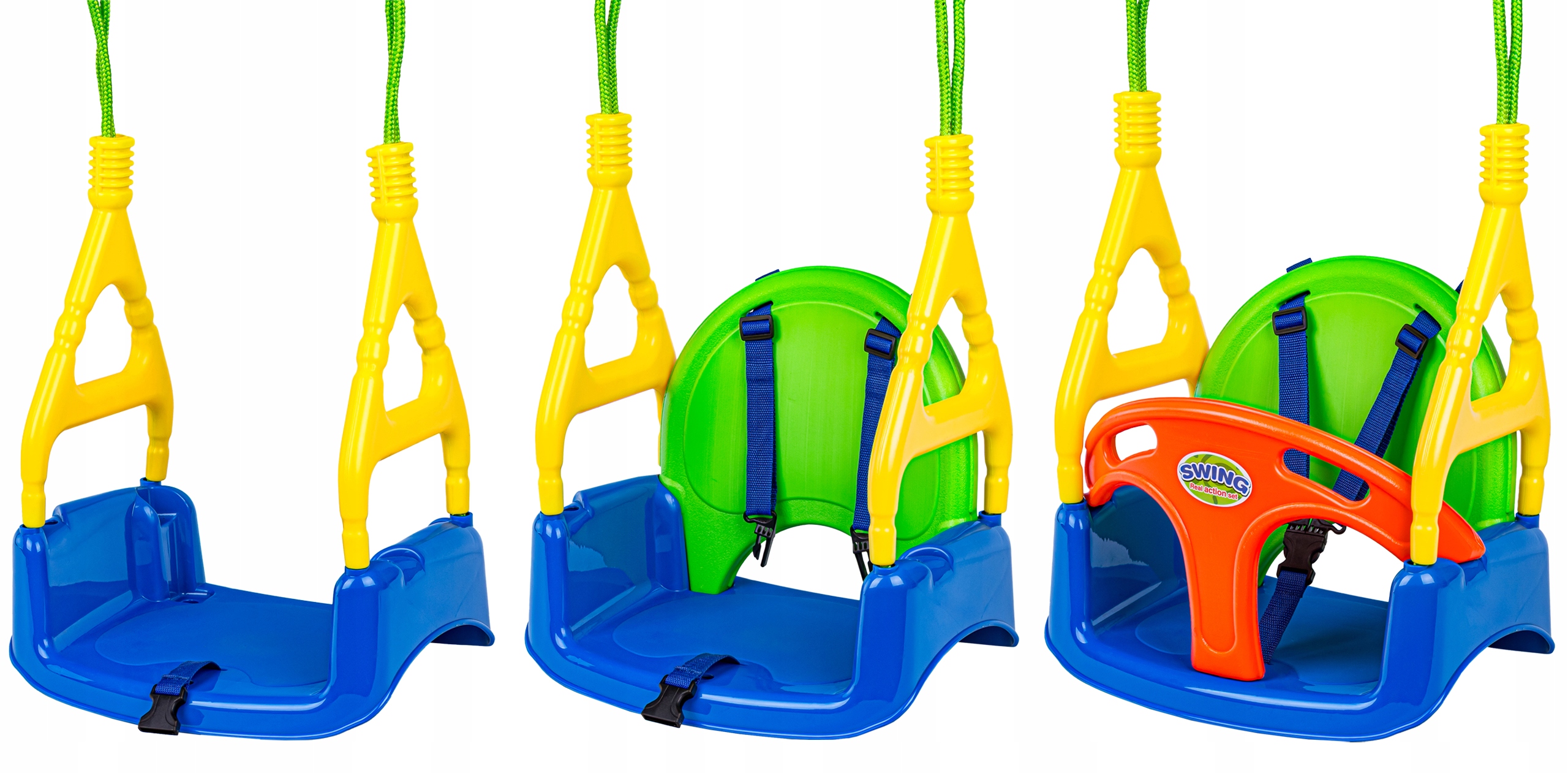 один продукт и до 3 возможностей! Качание может расти с вашим ребенком. Для ребенка вариант с фронтальной защитой является самым безопасным. Для старшего ребенка, качание с удобной спинкой и крупнейшим и более независимым детьми без поддержки и ремней безопасности.