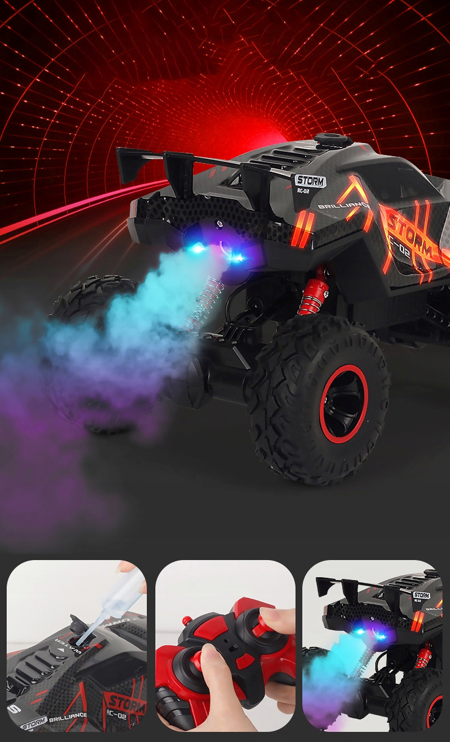 Представленный RC STORM автомобиль на дистанционном управлении представляет собой фантастически проработанное до мельчайших деталей транспортное средство с парогенератором, создающим эффект дыма из выхлоп.