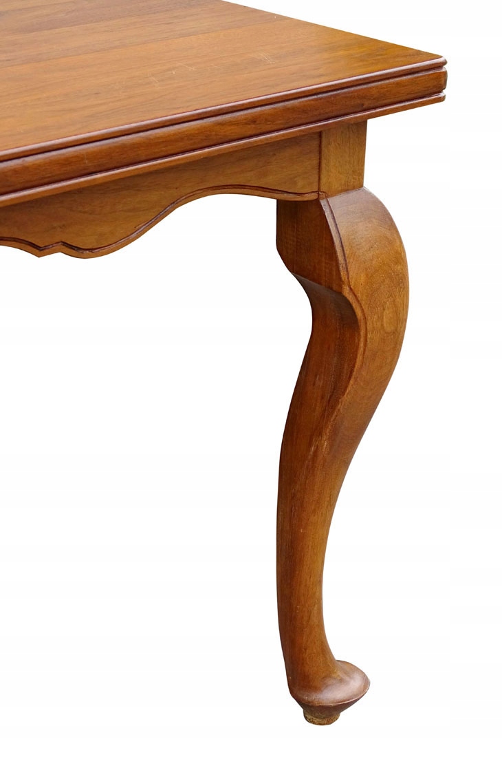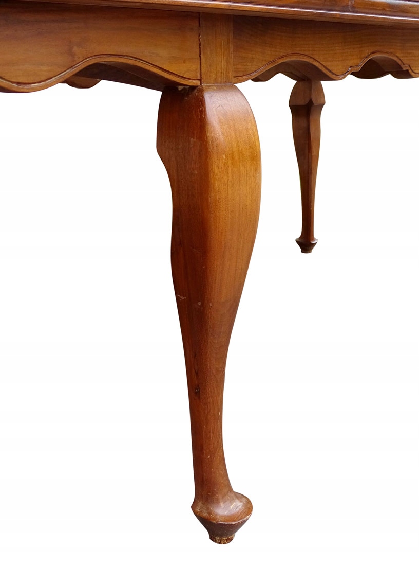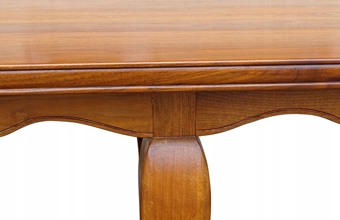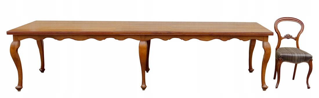 Стол прямоугольной формы со скошенным краем, установленный на широкой профилированной планке, с изящной фрезеровкой у основания. нижний. Все держится на шести массивных ножках, суженных книзу и заканчивающихся широкой ступней.