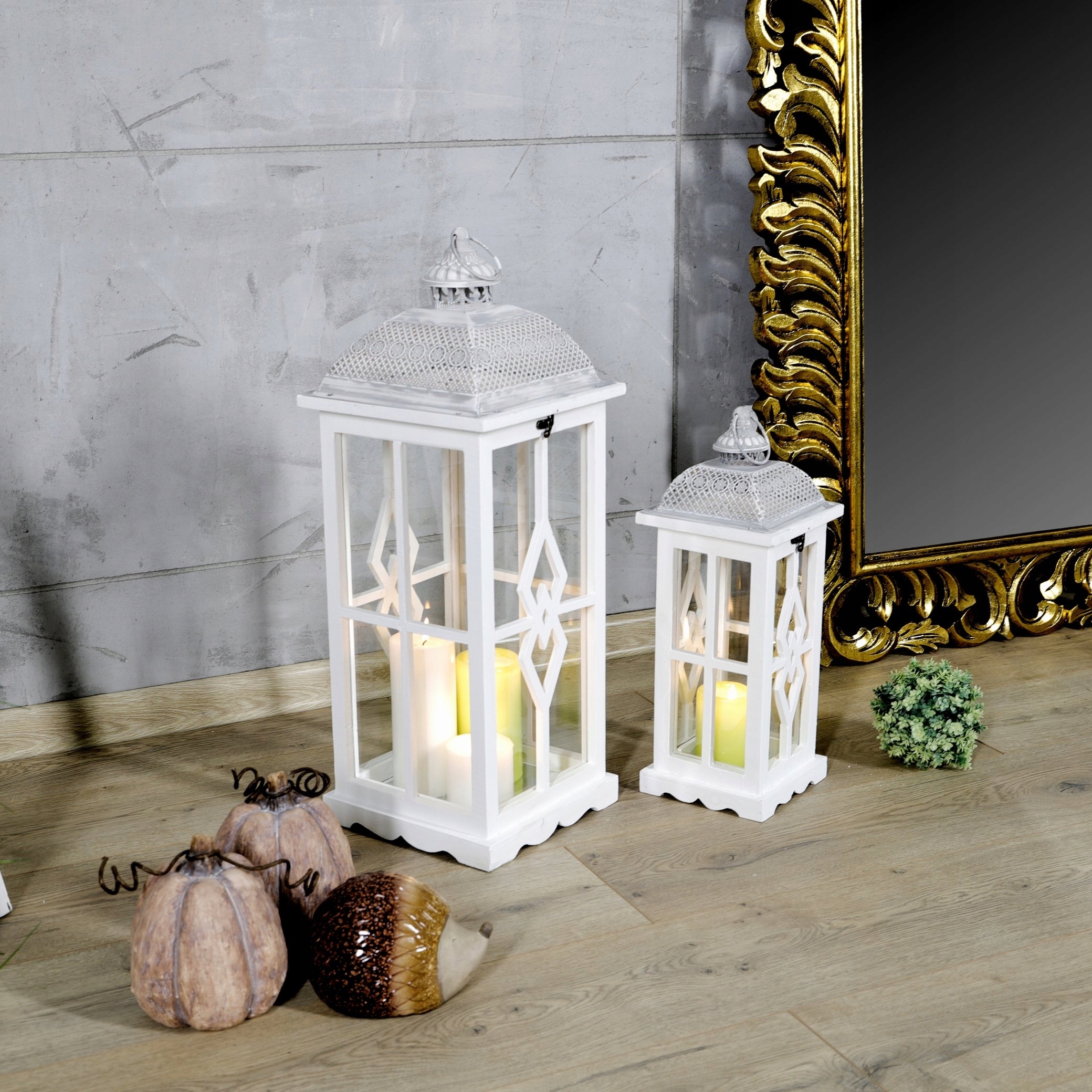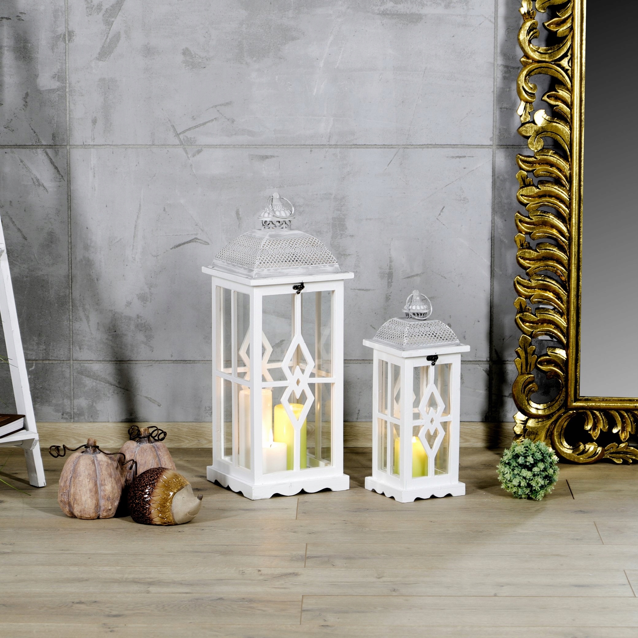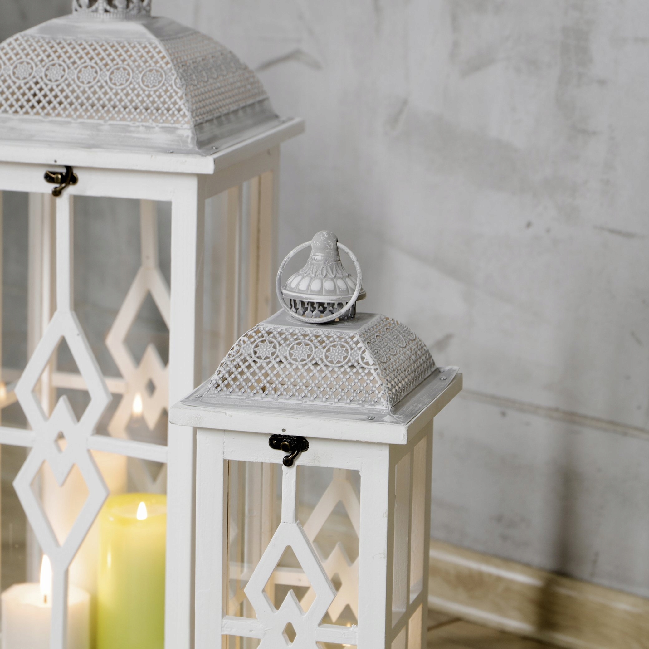 Представляем Вам деревянный фонарь, садовый фонарь белого цвета с серой металлической крышей . Это набор, состоящий из 2-х предметов - большого и маленького фонаря.