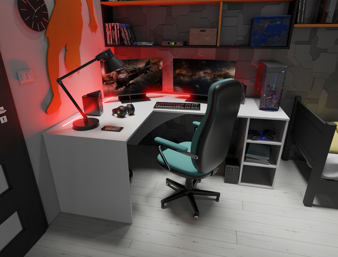 В каждой хорошо оформленной игровой комнате нужен письменный стол. Назначение мебели – не только разместить несколько экранов и другое ценное оборудование, но и обеспечить комфорт во время длительной игры. Чтобы успешно выполнять обе функции, стол должен быть достаточно большим — точь-в-точь как наш.