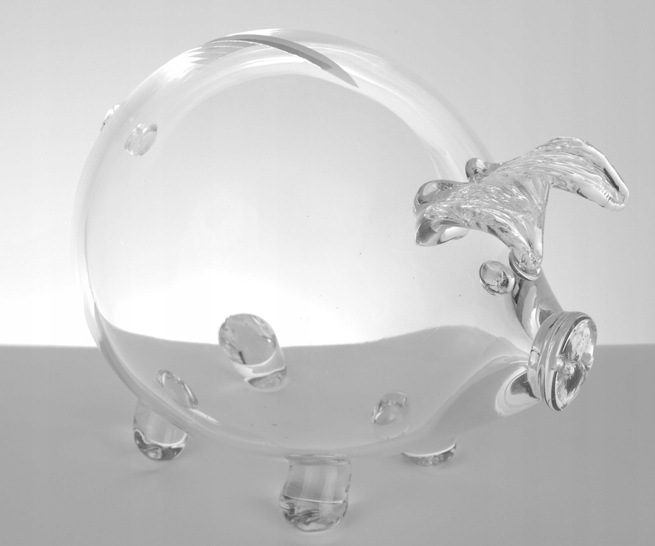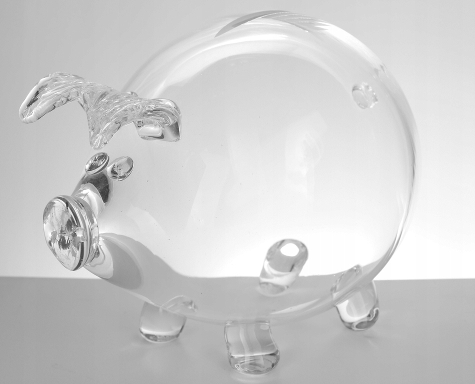 Копилка. Изготовлен из толстого стекла с красивой, бесцветной и блестящей стеклянной поверхностью. Польский продукт. У свиньи есть отверстие – прорезь вверху для вставки монет. Единственный способ получить сдачу — сломать ее.