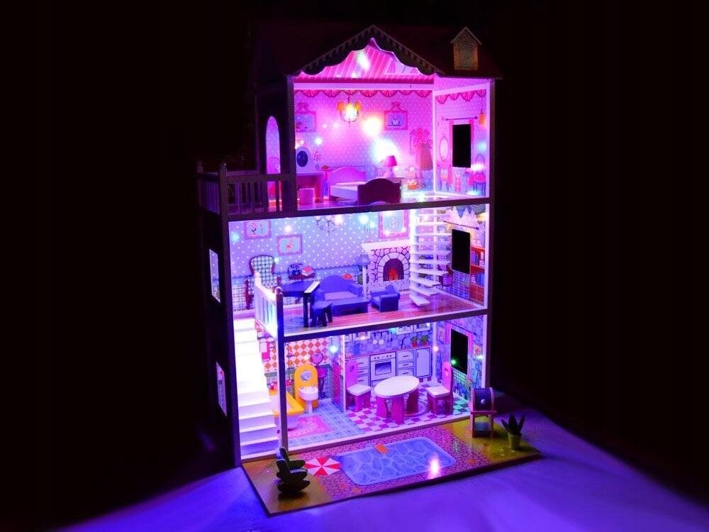 Очаровательный, сказочно красочный кукольный домик – мечта каждой девочки. В нем будет прекрасно себя чувствовать любая кукла размером с Барби. Кто бы не хотел там жить? Этот красивый трехэтажный деревянный кукольный домик, освещенный светодиодной подсветкой, полностью оборудован и имеет большие просторные комнаты, где можно постоянно переставлять красивую деревянную мебель и аксессуары. Богатое оснащение обеспечит долгое и прекрасное развлечение каждому ребенку.