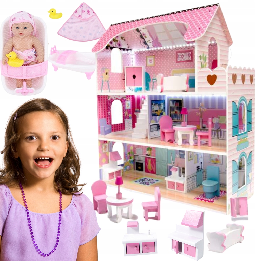 БОЛЬШОЙ ДЕРЕВЯННЫЙ КУКОЛЬНЫЙ ДОМИК СВЕТОДИОДНАЯ МЕБЕЛЬ ПОДАРОК XXL КУКЛА С ВАННОЙ
