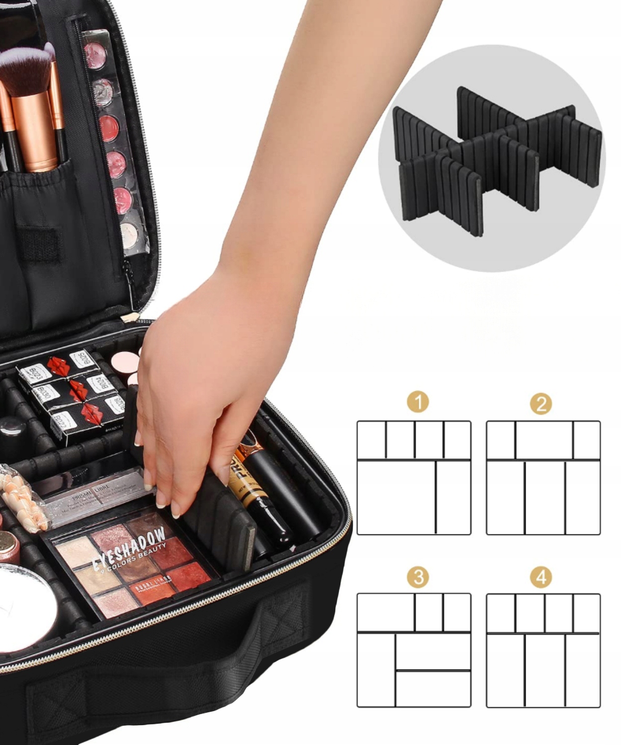 Большое количество регулируемых отделений и карманов позволяют разделять косметику, что упрощает поддержание порядка!