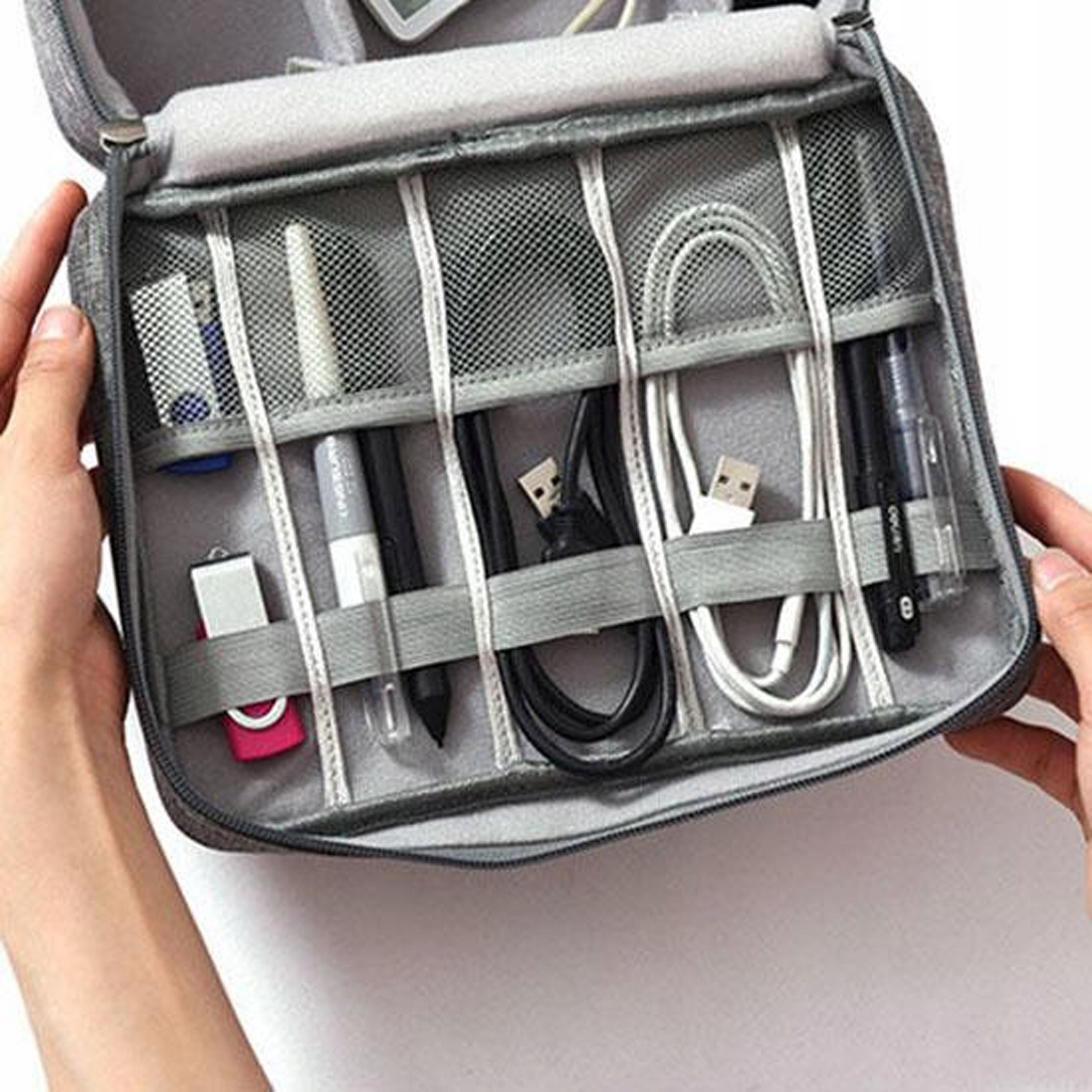 Материал, из которого изготовлен органайзер изготовлен водонепроницаемым. Защищает от случайного попадания воды, защищая кабели, зарядные устройства и другие небольшие электронные устройства. Кроме того, благодаря использованию легко очищаемых материалов поддерживать чистоту корпуса относительно просто и легко.
