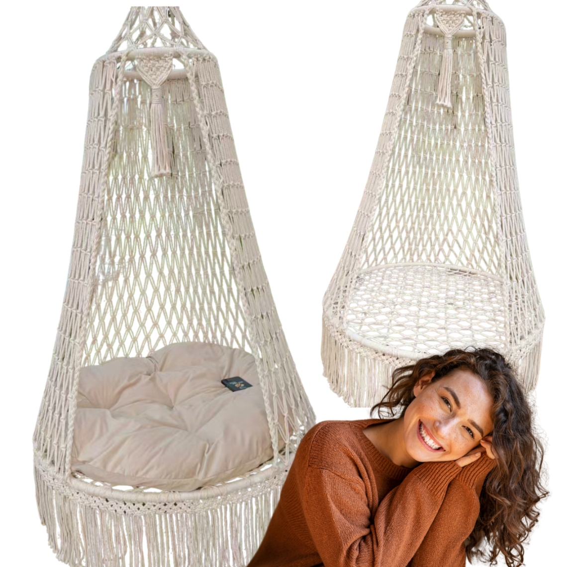 Стильный и удобный качание в климате Бохо, сделанная вручную, используя технику макрам, изготовленных из толстой бежевой струны. Он прекрасно работает дома, на террасе, балконе или в саду - идеально подходит для расслабления с книгой или кофе.