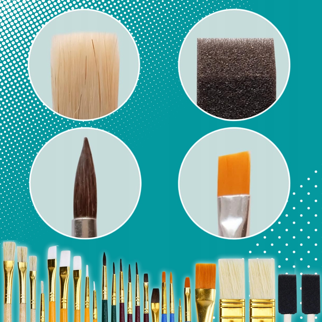 - В набор входят губчатые, плоские и круглые кисти с синтетическими и натуральными щетина