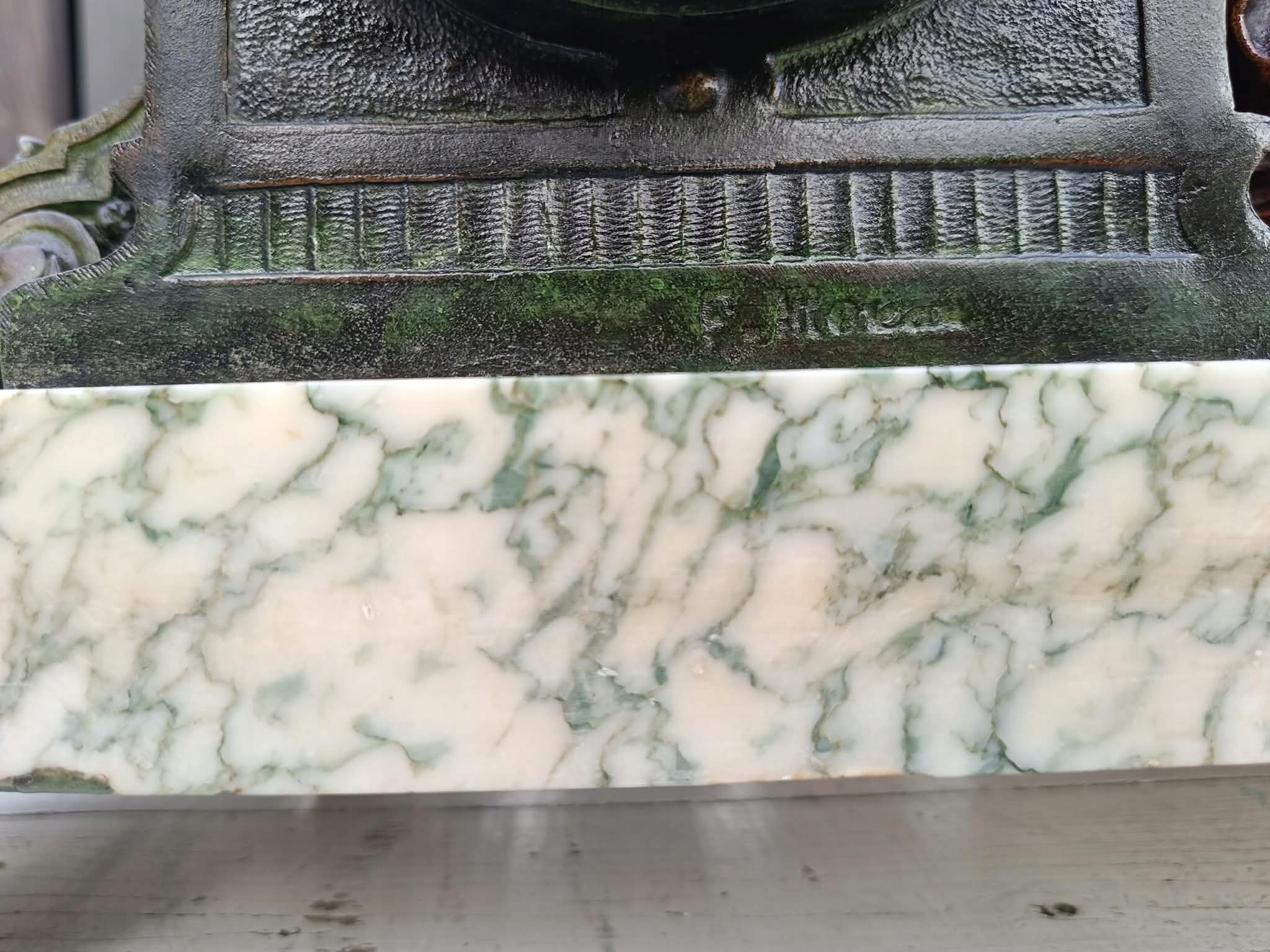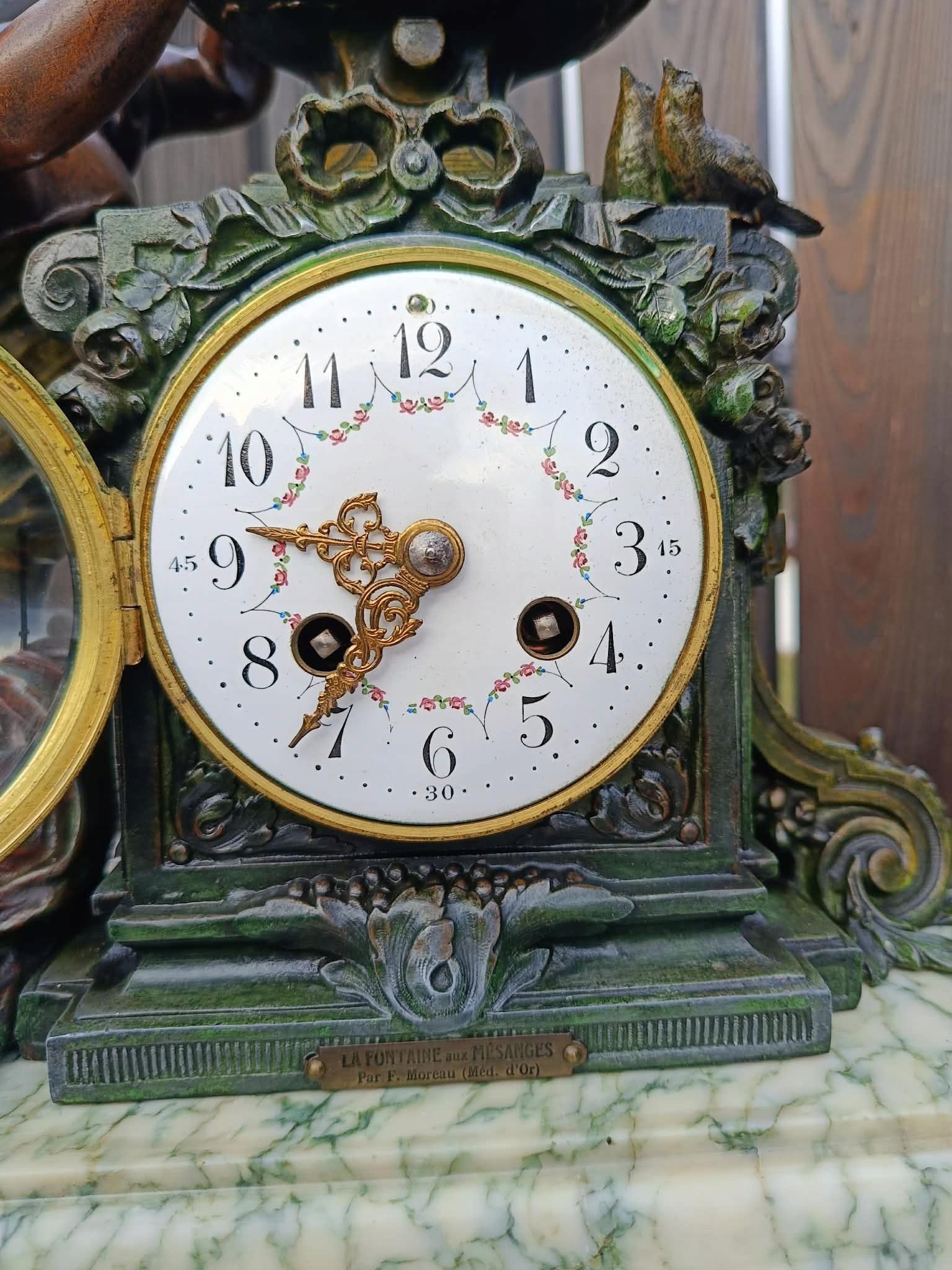 Циферблат механизма из фарфора - украшен цветочными гирляндами, в очень хорошем состоянии, стрелки красивой формы из позолоченной бронзы заканчиваются рыбкой.