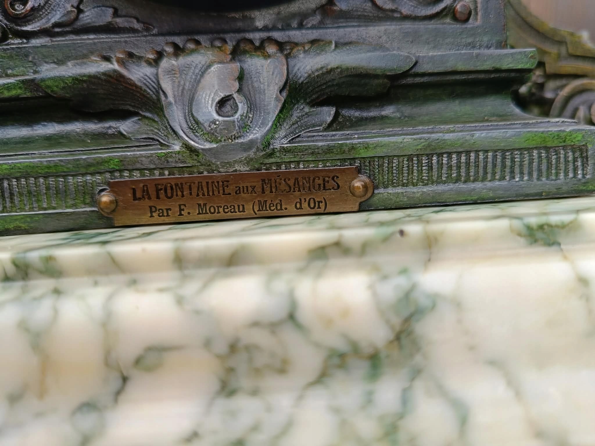 На часах изображена женщина, лежащая рядом с фонтаном, установленным на механизме, в сопровождении птиц.