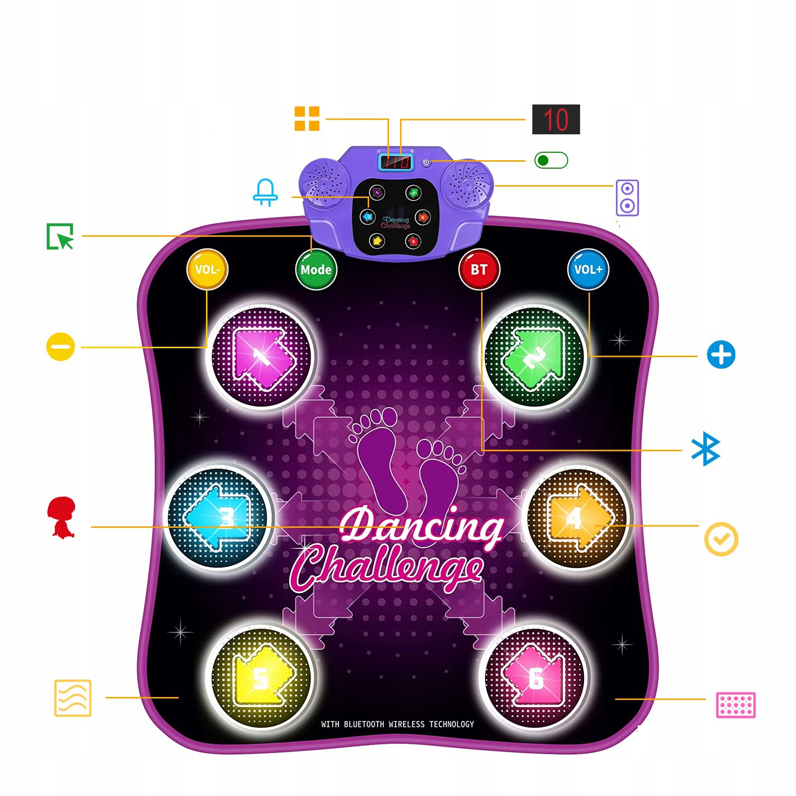 💃 Беспроводное соединение Bluetooth: Наш танцевальный коврик можно подключить к вашему смартфону через Bluetooth, так что вашим детям больше не придется беспокоиться о танцевальных песнях. Используя свой мобильный телефон, вы можете проигрывать все больше и больше интересных песен и заставлять своих детей любить танцевать. С нашим танцевальным ковриком Bluetooth у вас будет больше выбора песен во время танца.