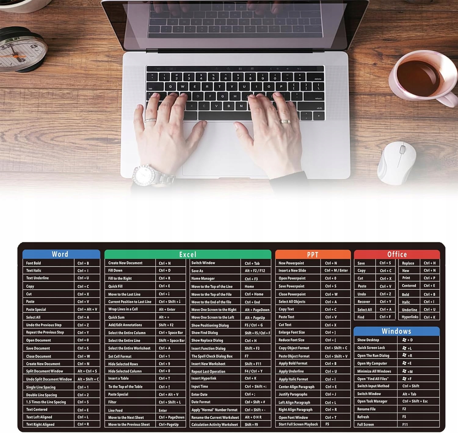 Все шаблоны на передней части являются ярлыками для WPS (Word/Excel/Power Point), которые могут обеспечить комфорт в нашей повседневной работе. Клавиатура и мышь могут быть помещены на прокладку мыши, чтобы минимизировать трение и защитить стол.