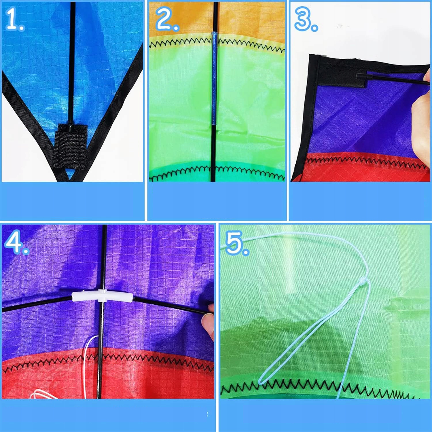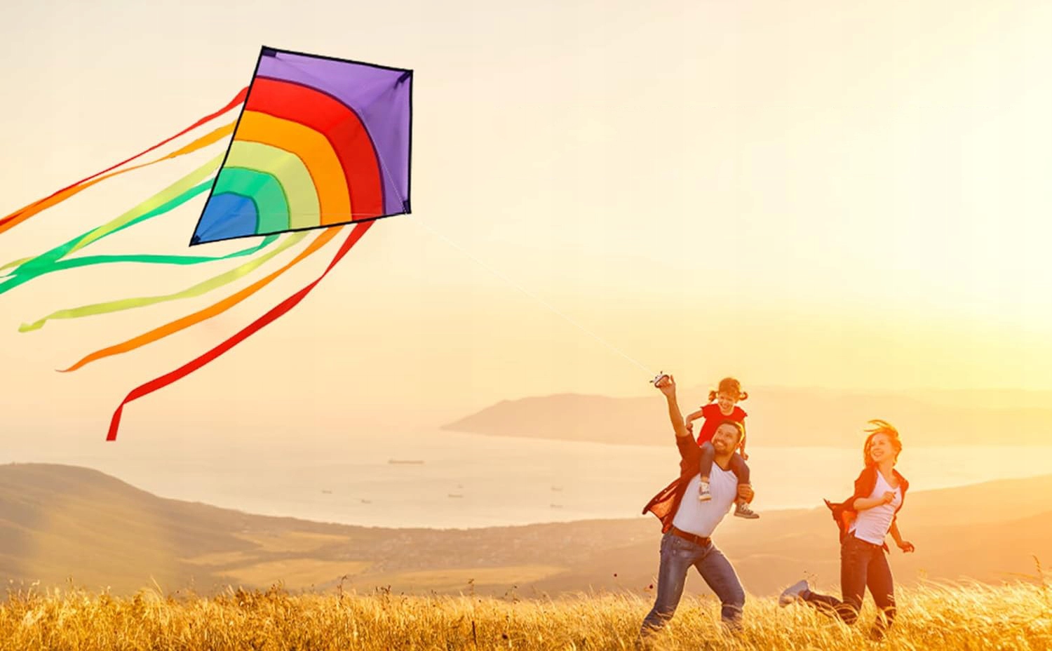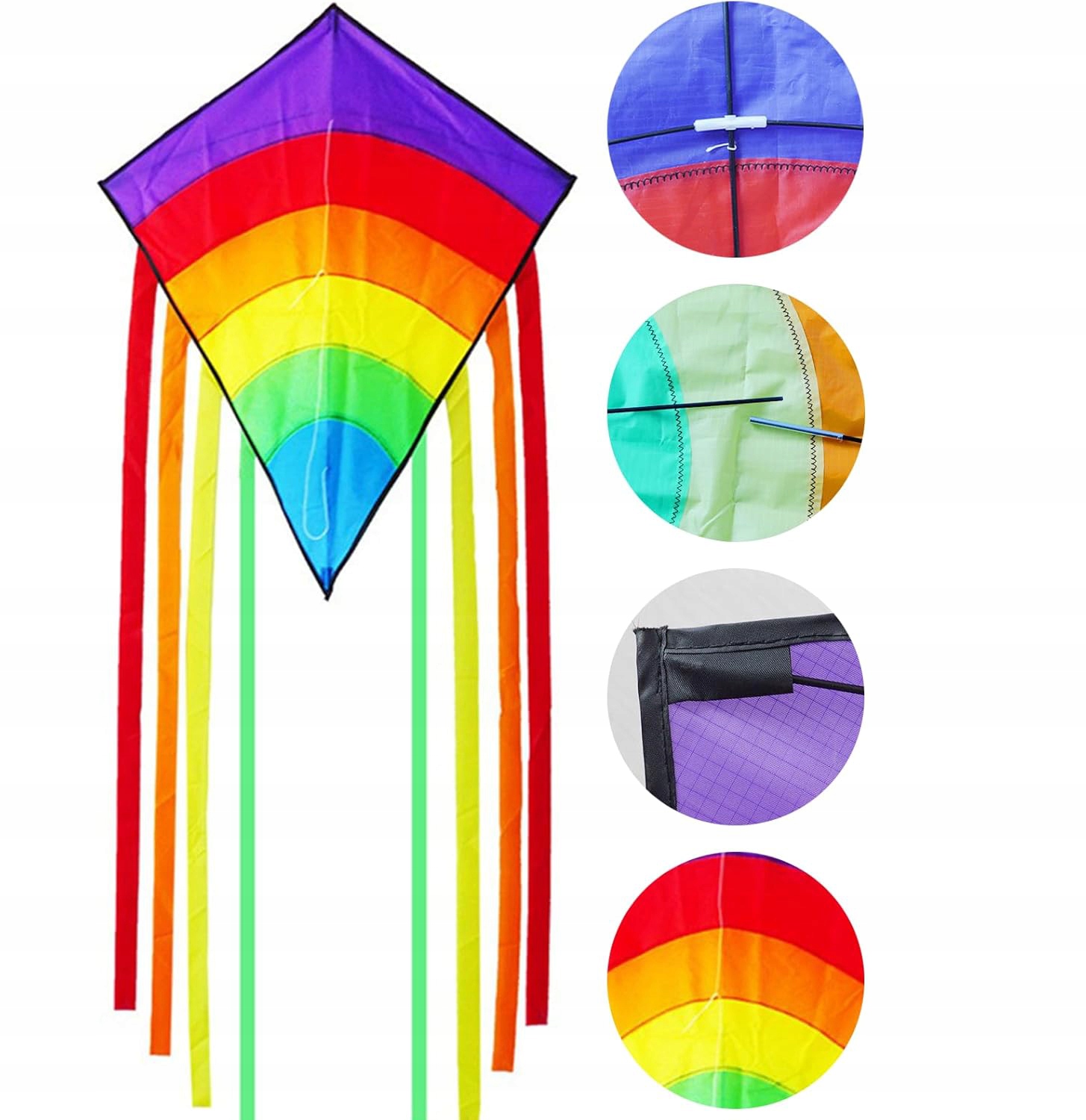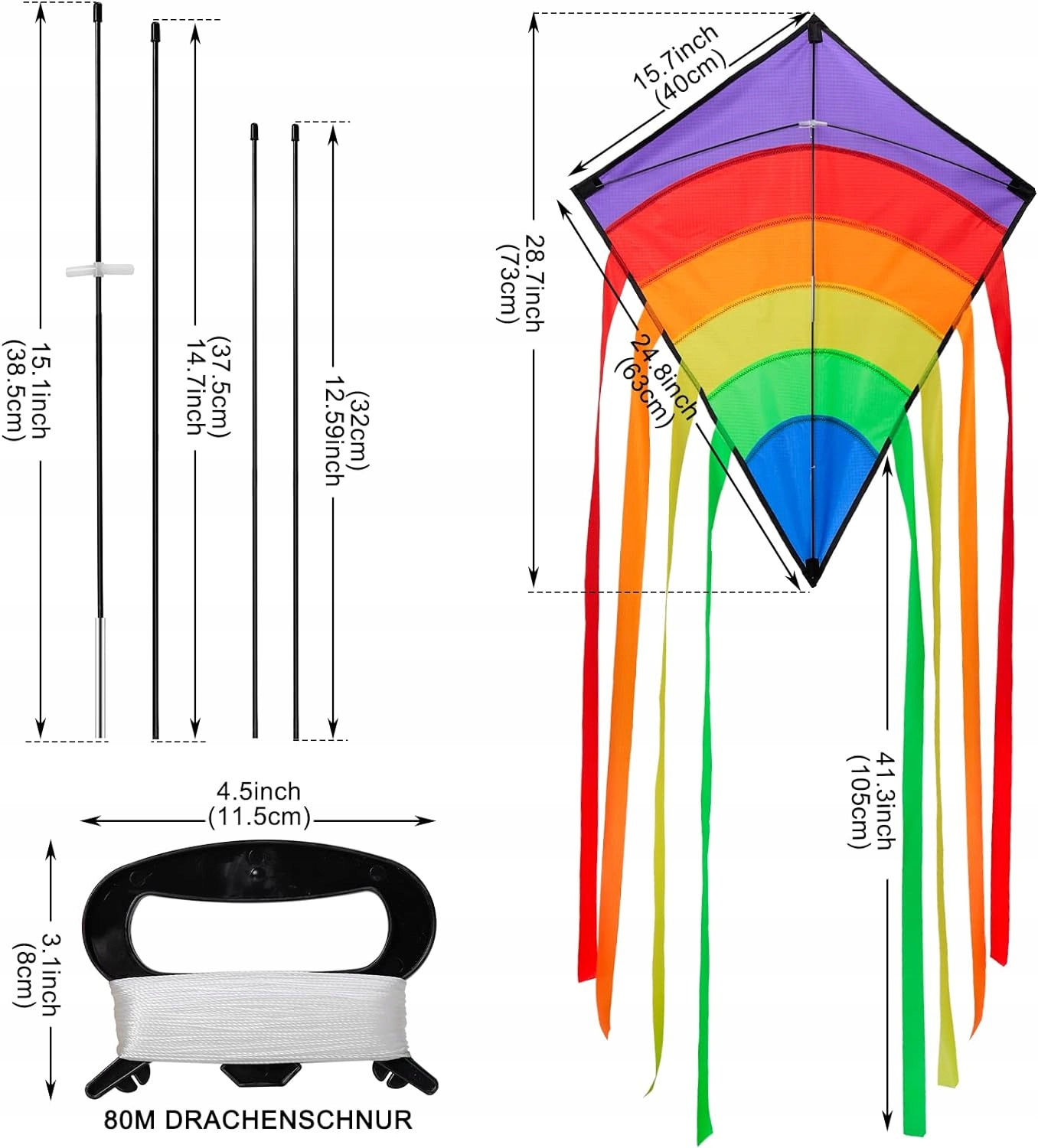 - Размеры Rainbow Kite 73 x 65 см, имеет 8 разноцветных хвостов длиной 105 см и веревку длиной 80 м.