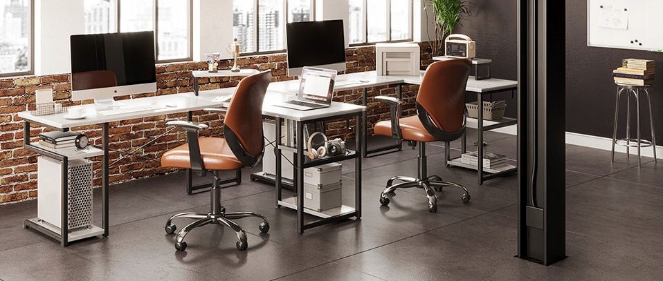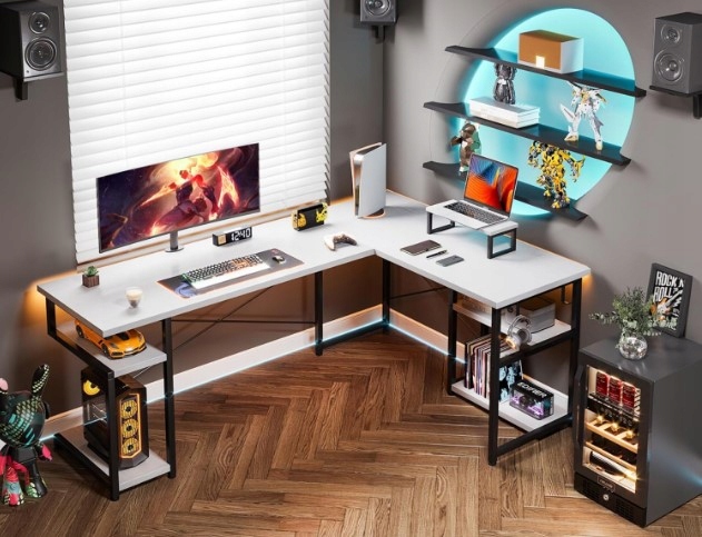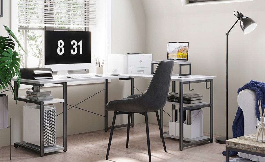 - Просторный L-образный стол: стол оснащен двумя большими столешницами разной длины, идеально подходит для хранения 2-3 мониторов или экранов, а также предлагает просторную поверхность для размещения компьютеров, книг, растений, принтеров, ноутбуков, клавиатуры и другие предметы повседневного обихода.