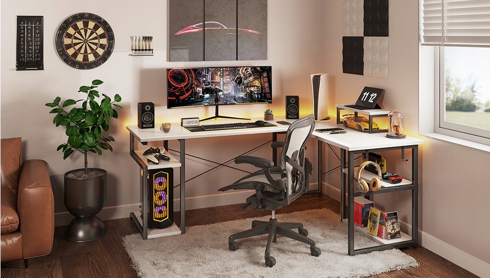 - Г-образный угловой дизайн: игровой стол Г-образной формы максимально увеличивает рабочее пространство в вашем домашнем офисе, идеально вписывается в угол и оптимизирует использование пространства. Универсальная функциональность углового игрового стола подходит как для работы, так и для игр, создавая индивидуальное рабочее пространство, которое эффективно улучшает ваш рабочий процесс и игровой опыт.