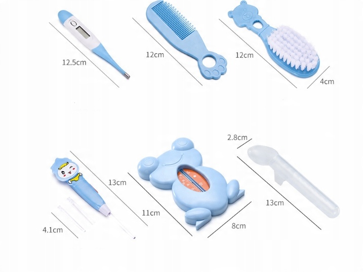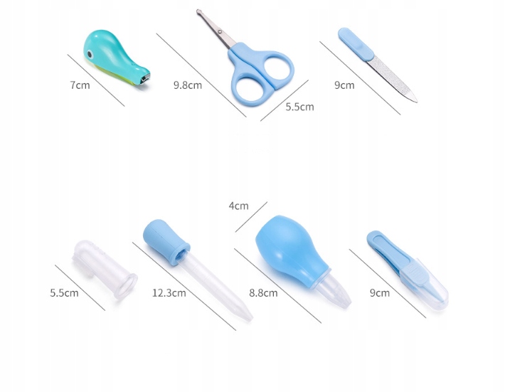 В комплект входит небольшой и гибкий назальный аспиратор для комфорта ребенка. Удобная силиконовая зубная щетка для чистки зубов и языка вашего ребенка. Ушные ложечки со светодиодной подсветкой позволяют легко чистить ушки вашего ребенка и наблюдать за ними. 4. Градуировка на ложке для кормления и пипетке делает кормление ребенка более точным и легким. Ножницы с закругленным лезвием не повредят ребенку.