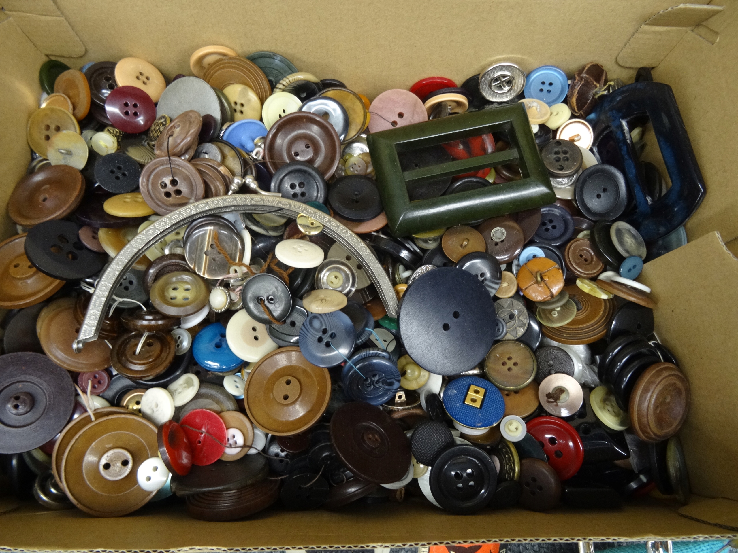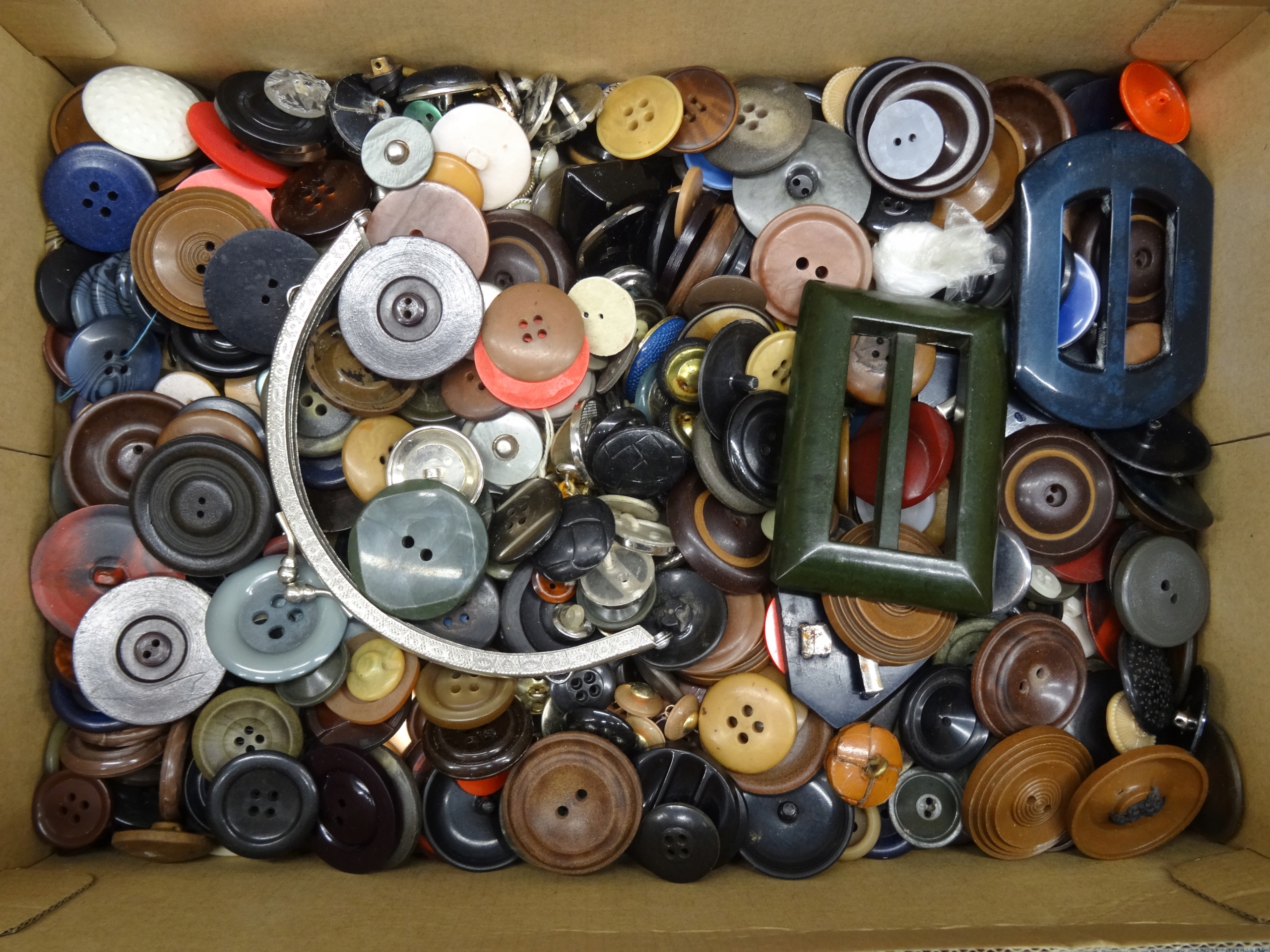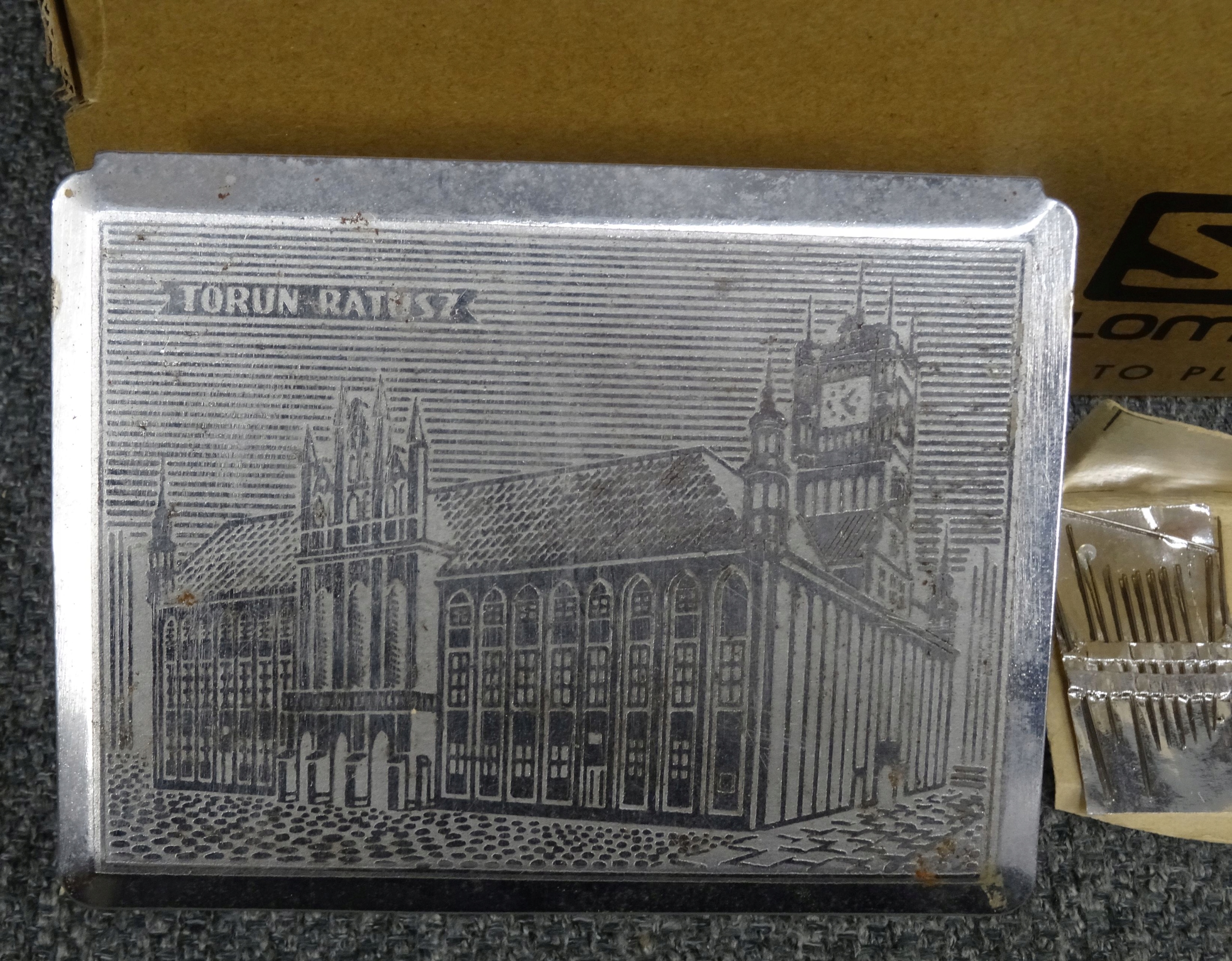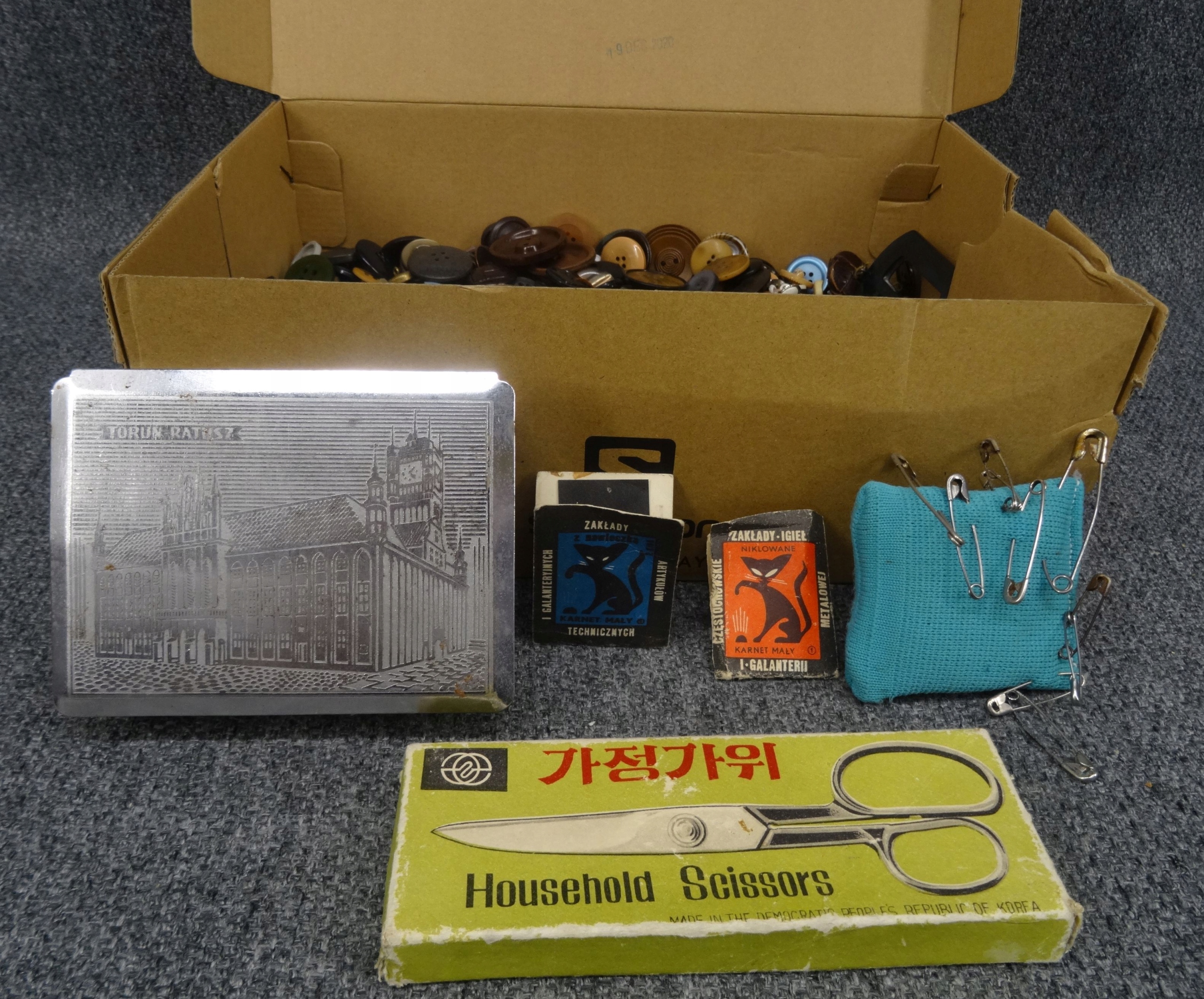 Большой набор портных: кнопки, пряжки, иглы, булавки для безопасности. Кнопки, упакованные в обувную коробку, наполовину заполненную. Участок в декоративной металлической коробке с надписью ратуши Торунь. Всего несколько сотен элементов.