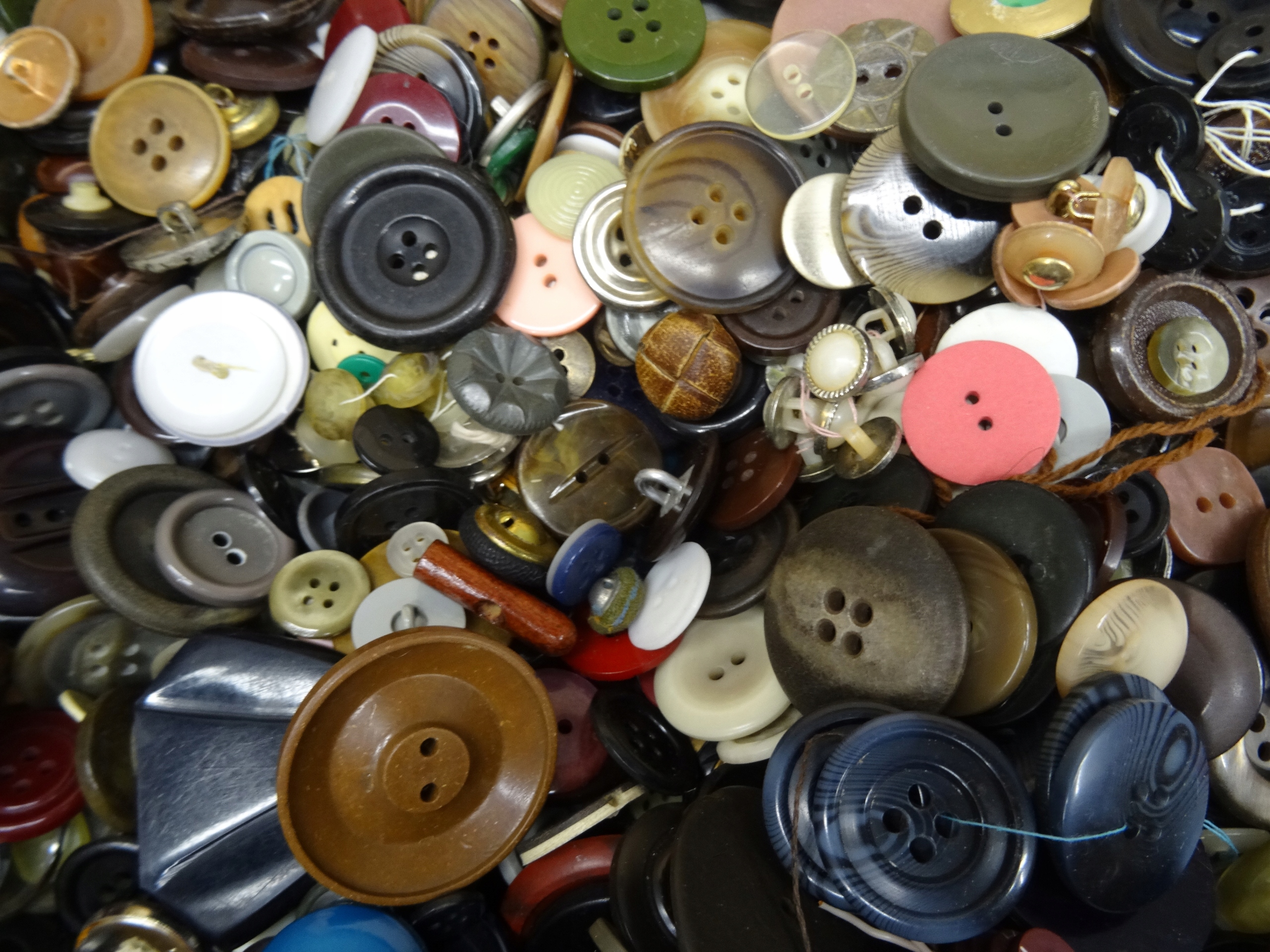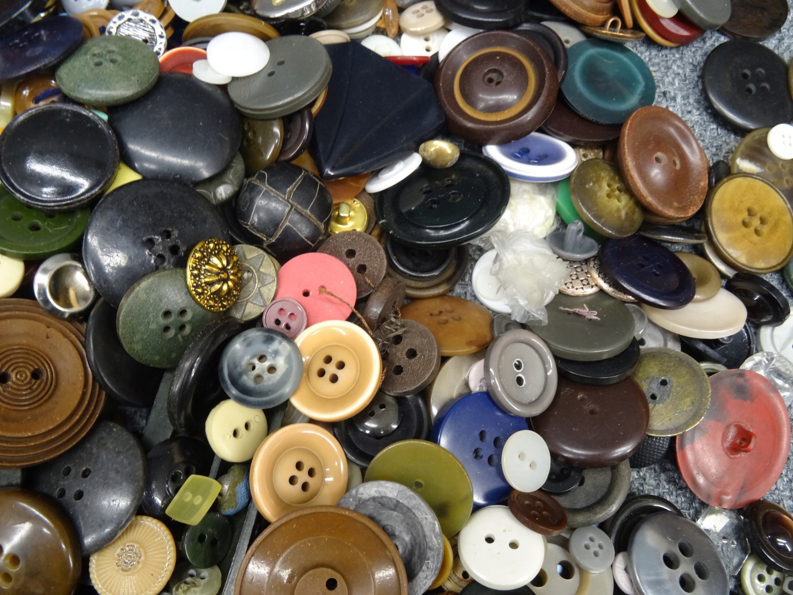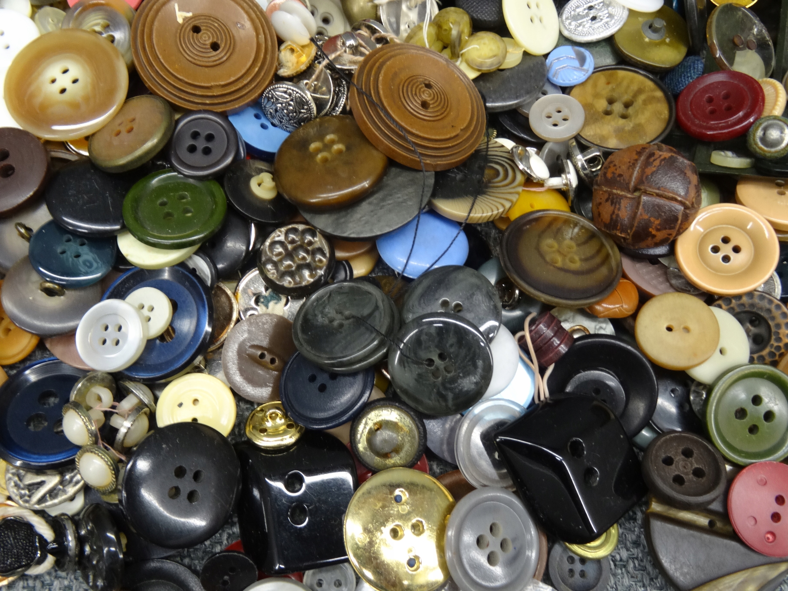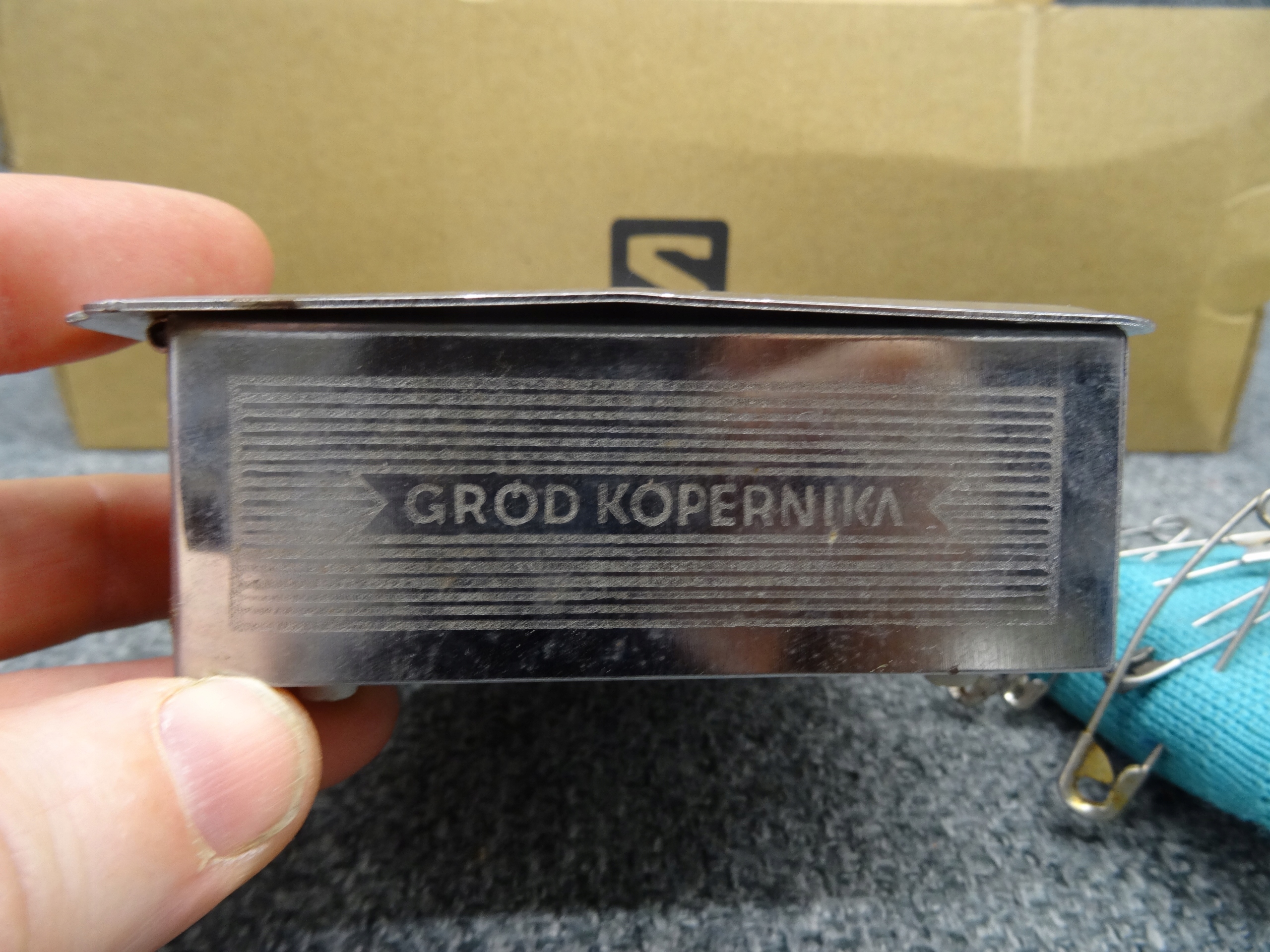 Большой набор портных: кнопки, пряжки, иглы, булавки для безопасности. Кнопки, упакованные в обувную коробку, наполовину заполненную. Участок в декоративной металлической коробке с надписью ратуши Торунь. Всего несколько сотен элементов.