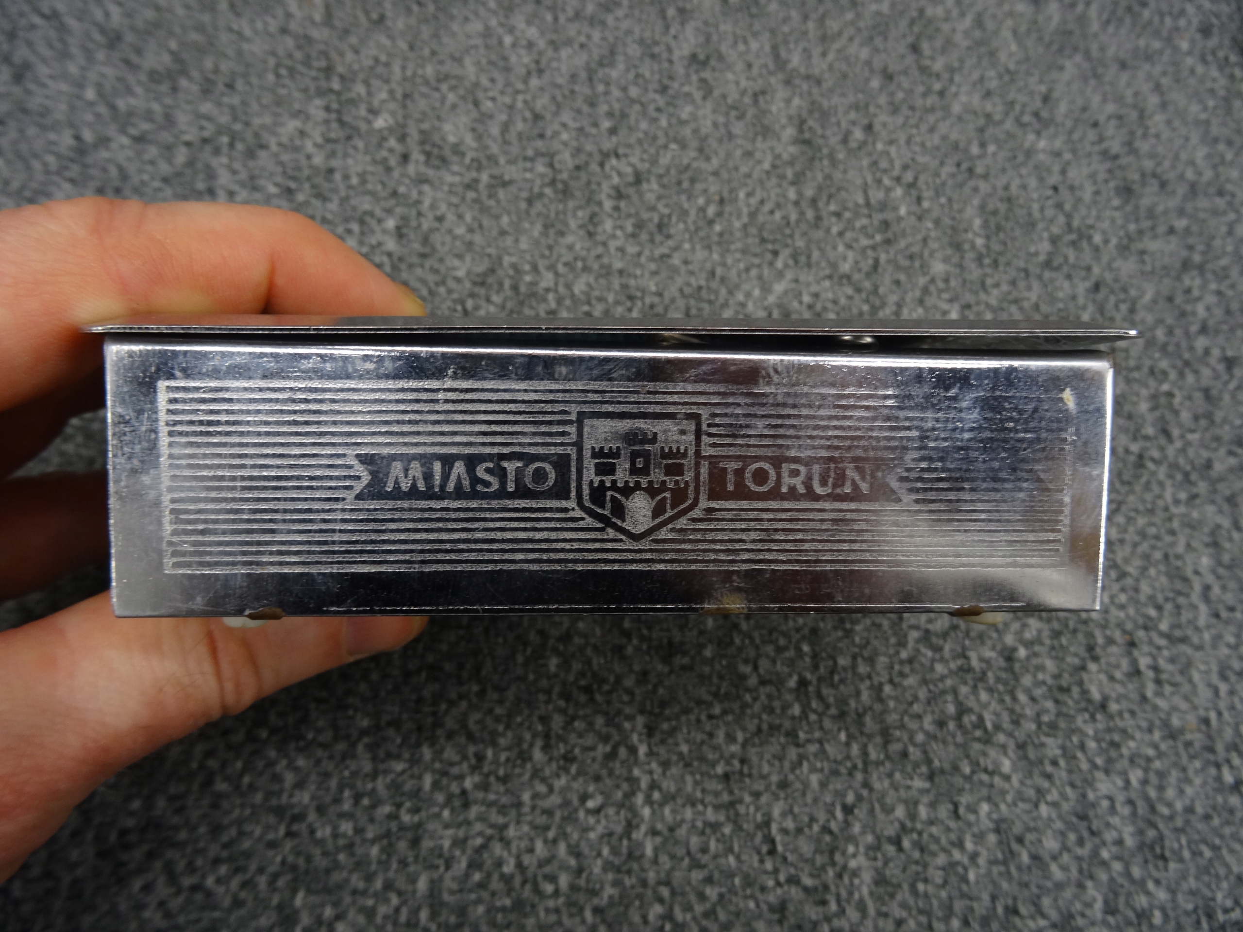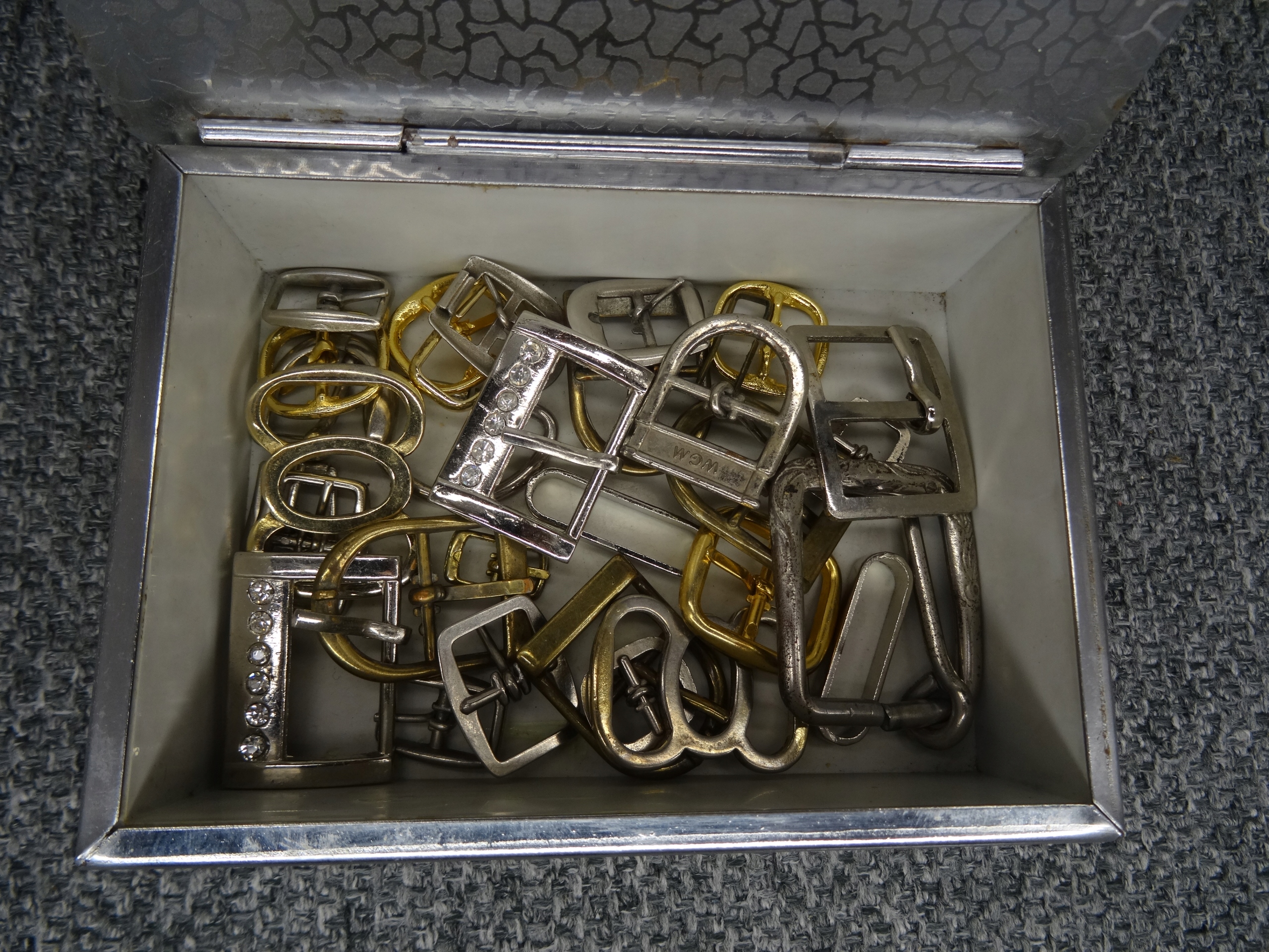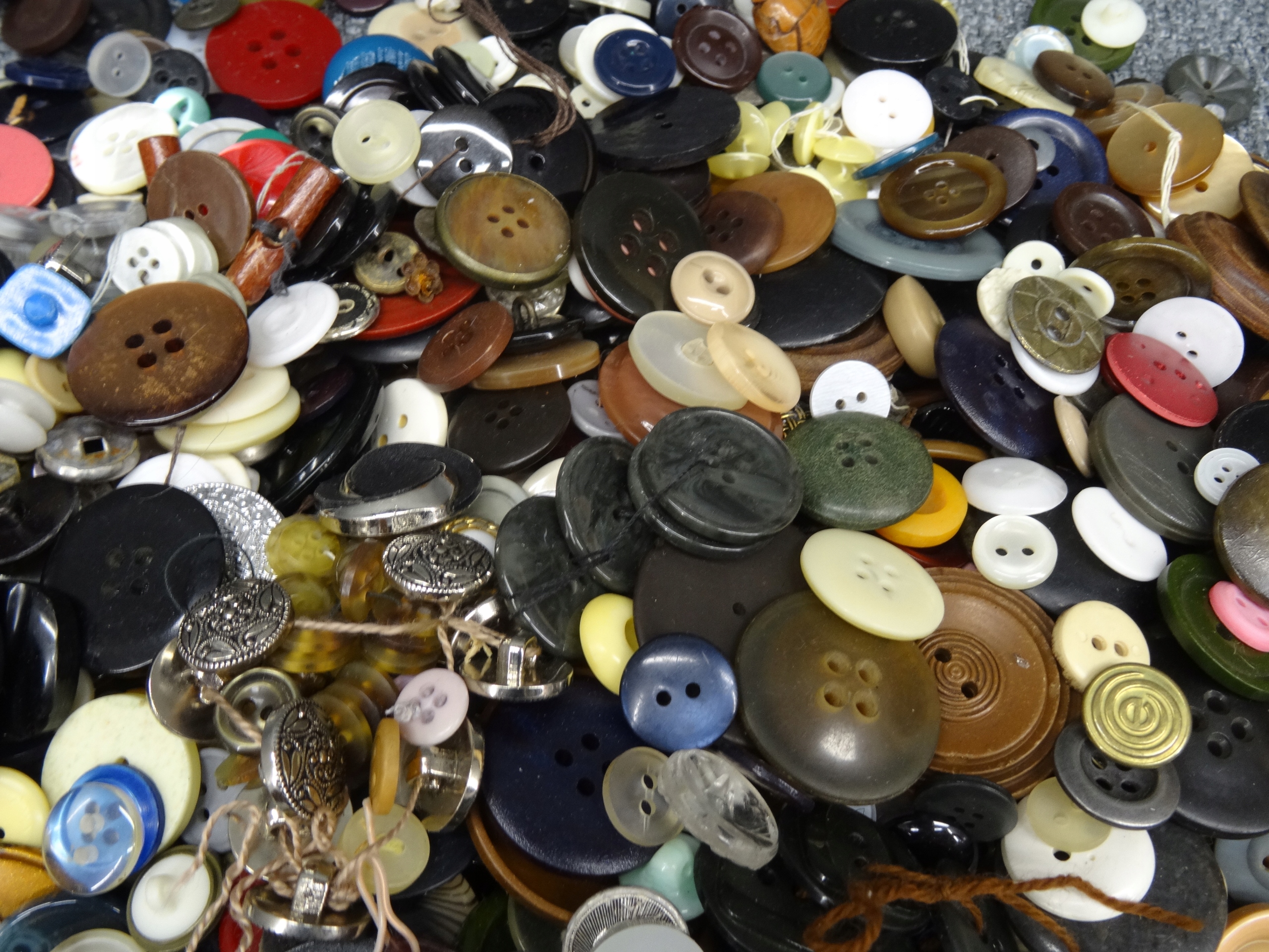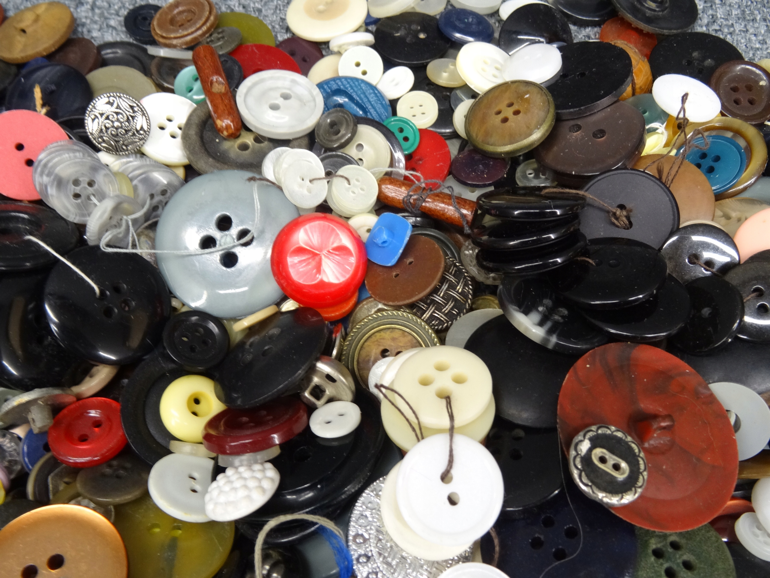 Большой набор портных: кнопки, пряжки, иглы, булавки для безопасности. Кнопки, упакованные в обувную коробку, наполовину заполненную. Участок в декоративной металлической коробке с надписью ратуши Торунь. Всего несколько сотен элементов.
