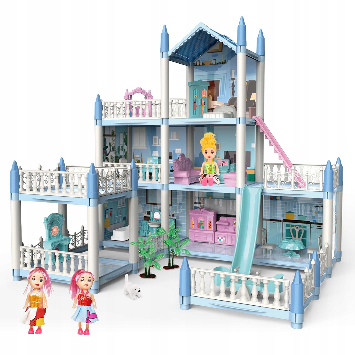 БОЛЬШОЙ КУКОЛЬНЫЙ ДОМИК СВЕТОДИОДНЫЙ СВЕТ АКСЕССУАРЫ МЕБЕЛЬ СОБАКА КУКЛА 7 комнат 3 этажа.
