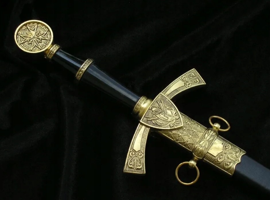 - Рукоятка: сталь, пластиковая облицовка, сплав цинка и алюминия, гарда с крестом и лилиями Флер-де-Лис,
