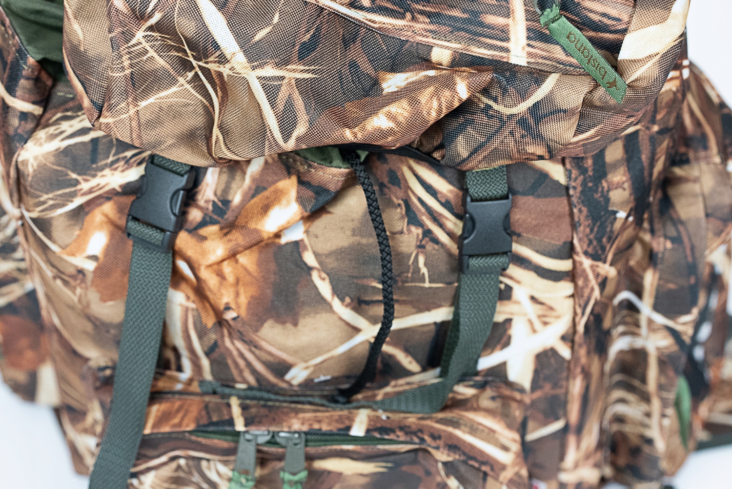 Охотничий рюкзак с узором, имитирующим натуральный камыш, листья и ветки. Верхний клапан рюкзака застегивается на пряжки.