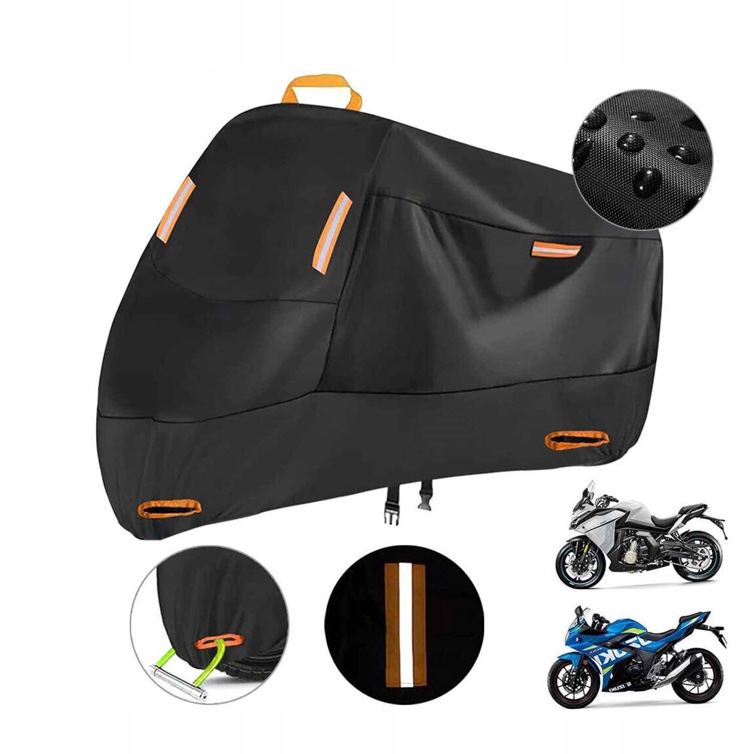 - Повышает видимость ночью благодаря 4 интегрированным отражающим ремням, которые помогают легко найти мотоцикл в условиях плохого освещения, минимизируя риск столкновения в условиях низкого освещения. W zestawie przenośna torba do przechowywania, która pozwala na łatwą organizację i przechowywanie.