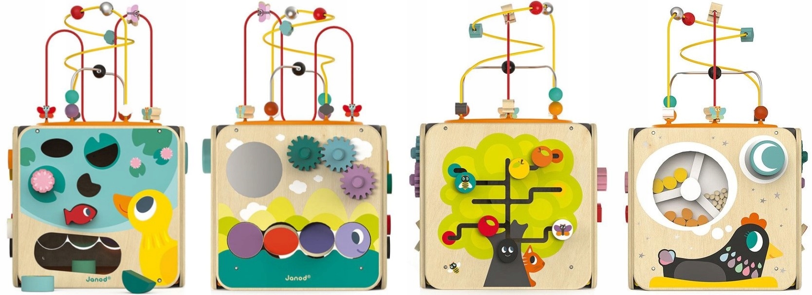 Многофункциональный развивающий кубик с петелькой французского бренда JANOD — идеальная игрушка для детей от 18 месяцев.