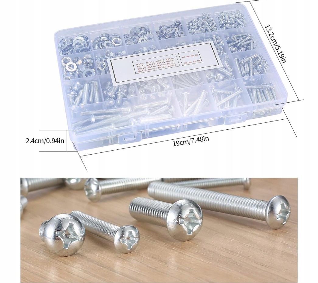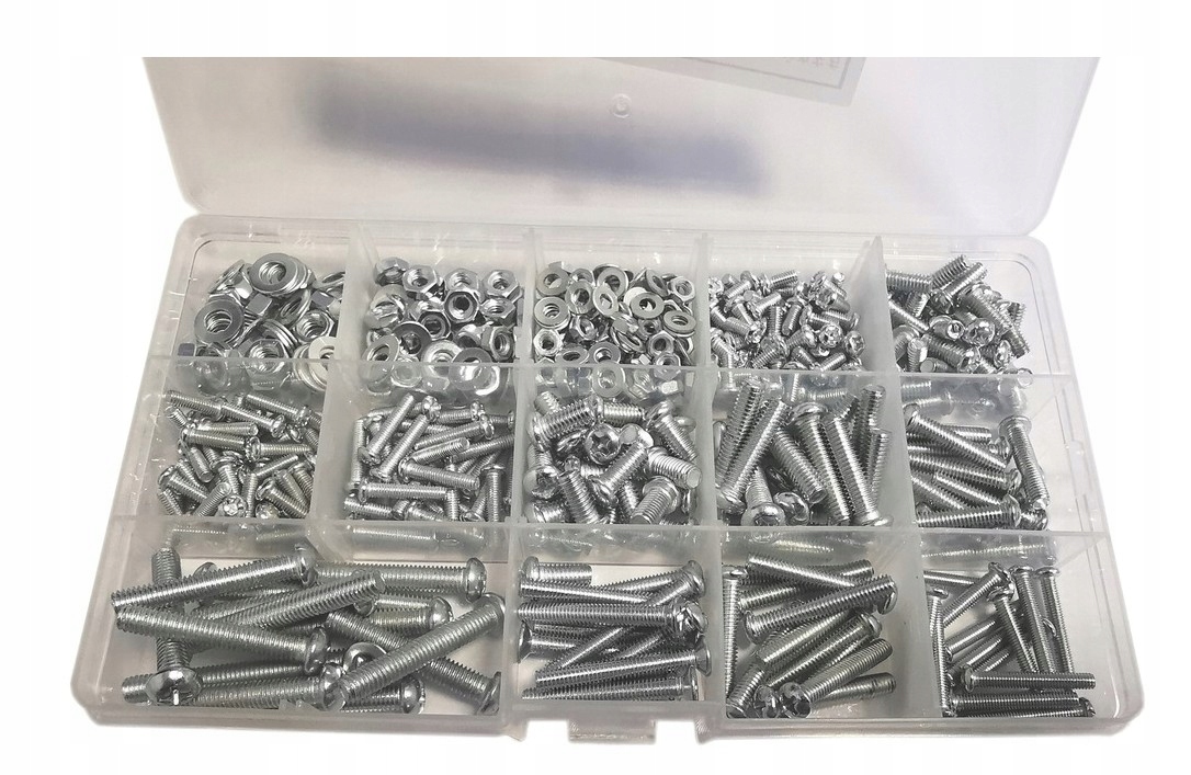 - Он содержит наиболее популярные размеры винтов, орехов и прокладки: M3, M4, M5, M6