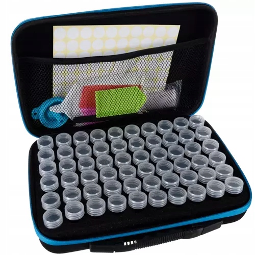 В футляре целых 60 баночек, в него легко поместятся все бриллианты. Кроме того, вы можете описать и покрыть бриллианты любого цвета. У каждой баночки свое место. Причем каждый прикручен. Их можно снять для вышивания. Чехол изготовлен из твердого материала и закрывается на молнию. Он также имеет эргономичную ручку для переноски.