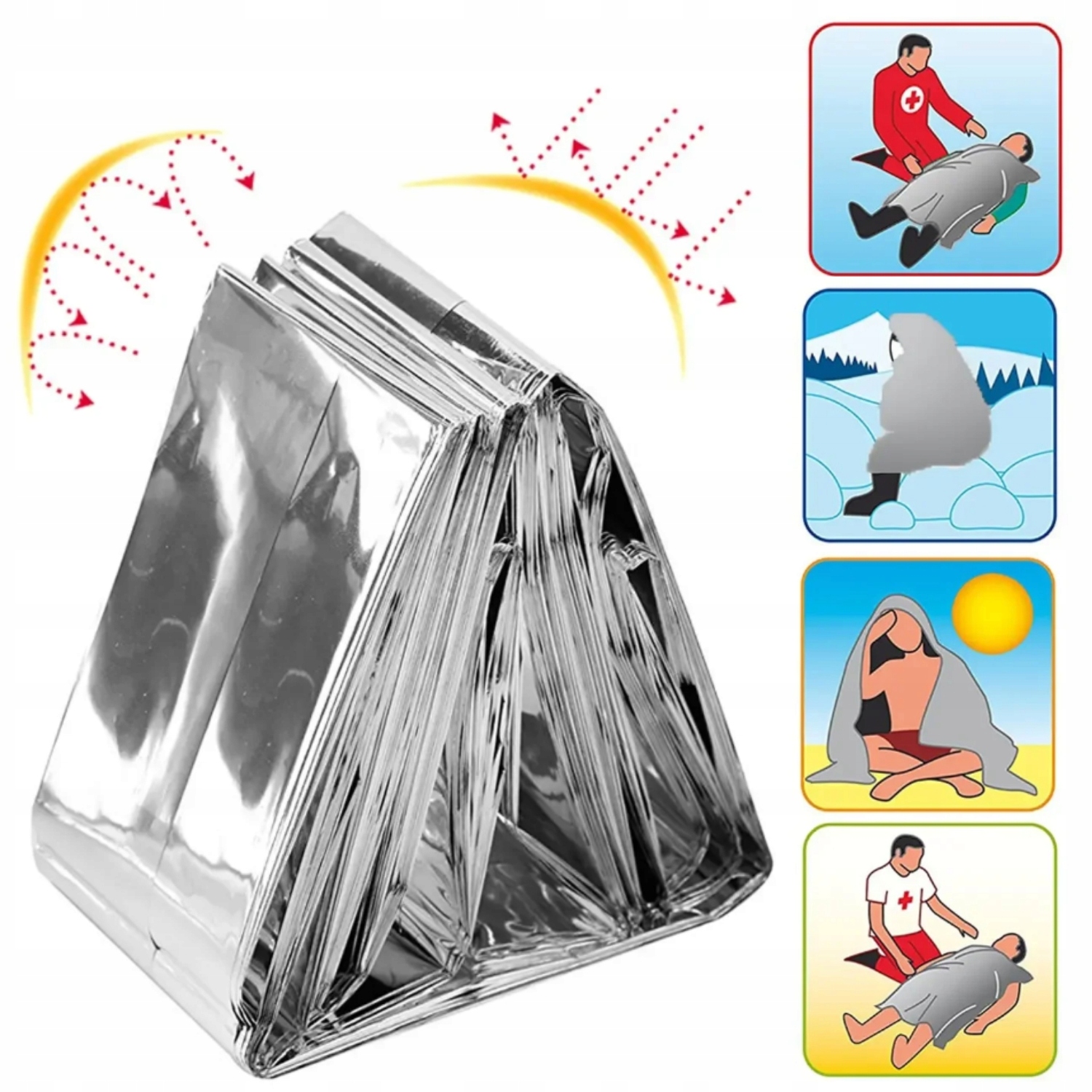 Защищает от переохлаждения и позволяет согреть тело в сложных погодных условиях. Одеяло также защищает от перегрева – его серебряная сторона отражает солнечный свет.