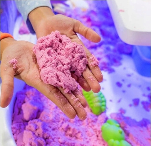- Кинетический песок – отличный способ времяпрепровождения вашего ребенка. Интересные цвета и дополнительные аксессуары позволяют детям играть часами. Песок позволяет создавать фантастические конструкции, которые можно легко разрушить после того, как вы закончите играть, и начать играть снова.