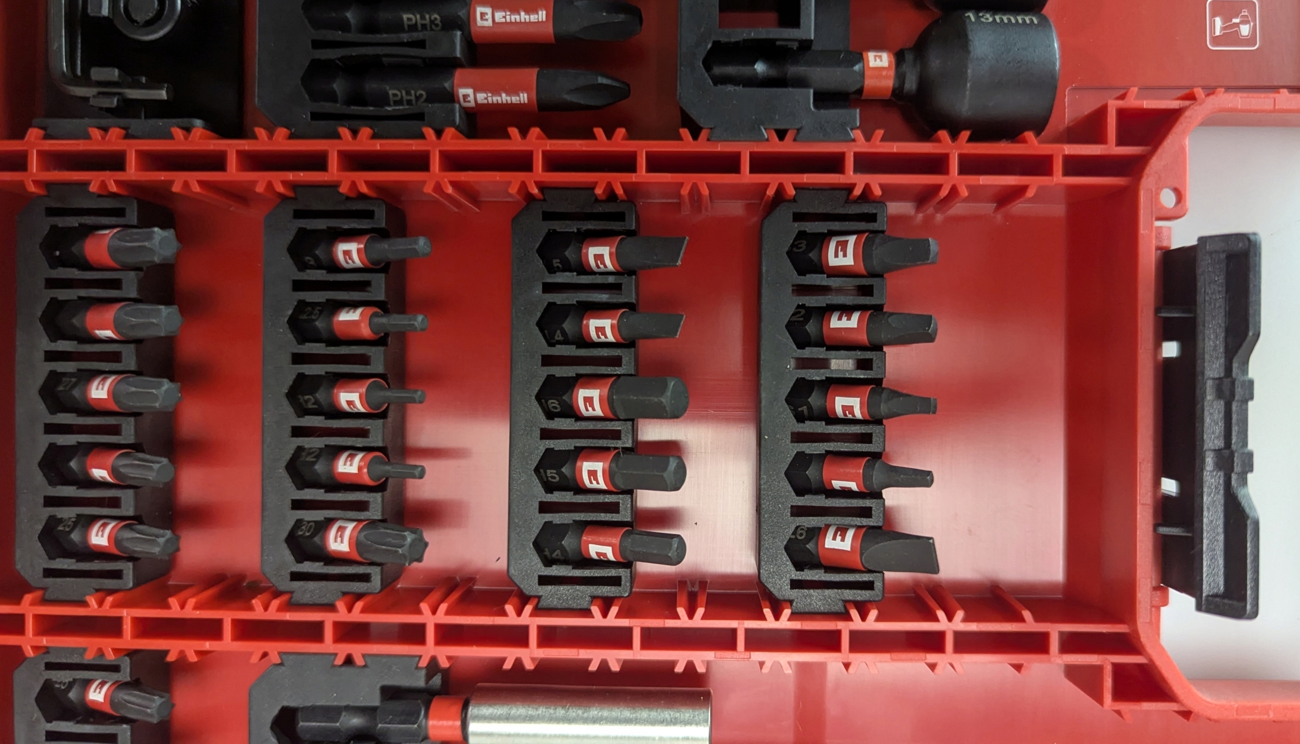 - 8x битов, устойчивые к удару в 50 мм (PH2/PH3/PZ2/PZ3/T15/T20/T25/T30)