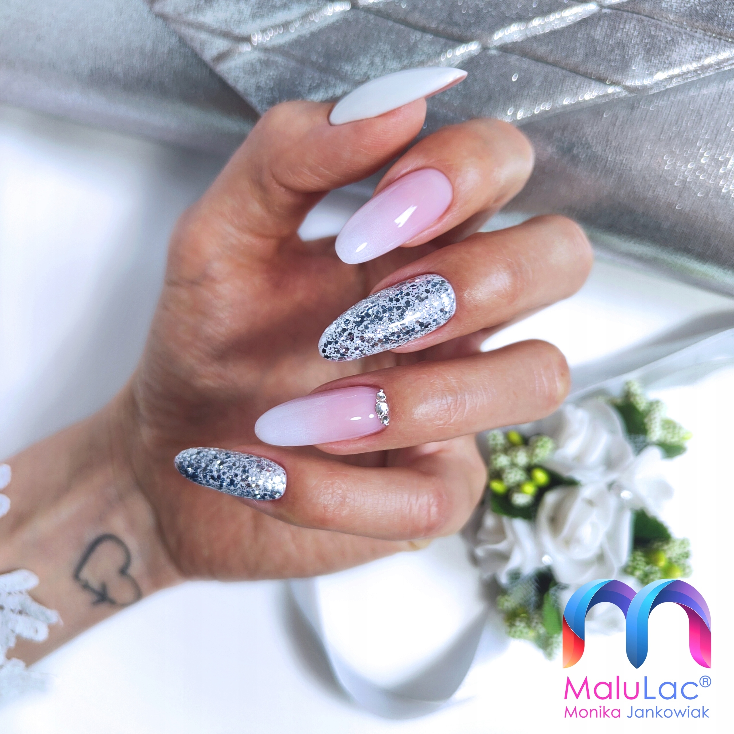 ⭐ GLOSSY PINK - Оттенок розового с высокой степенью покрытия, выбеленный, обогащенный серебряными частицами. Предложение мечты для поклонников вечной элегантности. Стилизации, выполненные с помощью этого геля, будут нежными, но их трудно не заметить. Они будут идеальны на каждый день, а также для более крупных мероприятий, когда вам нужно произвести большое впечатление.