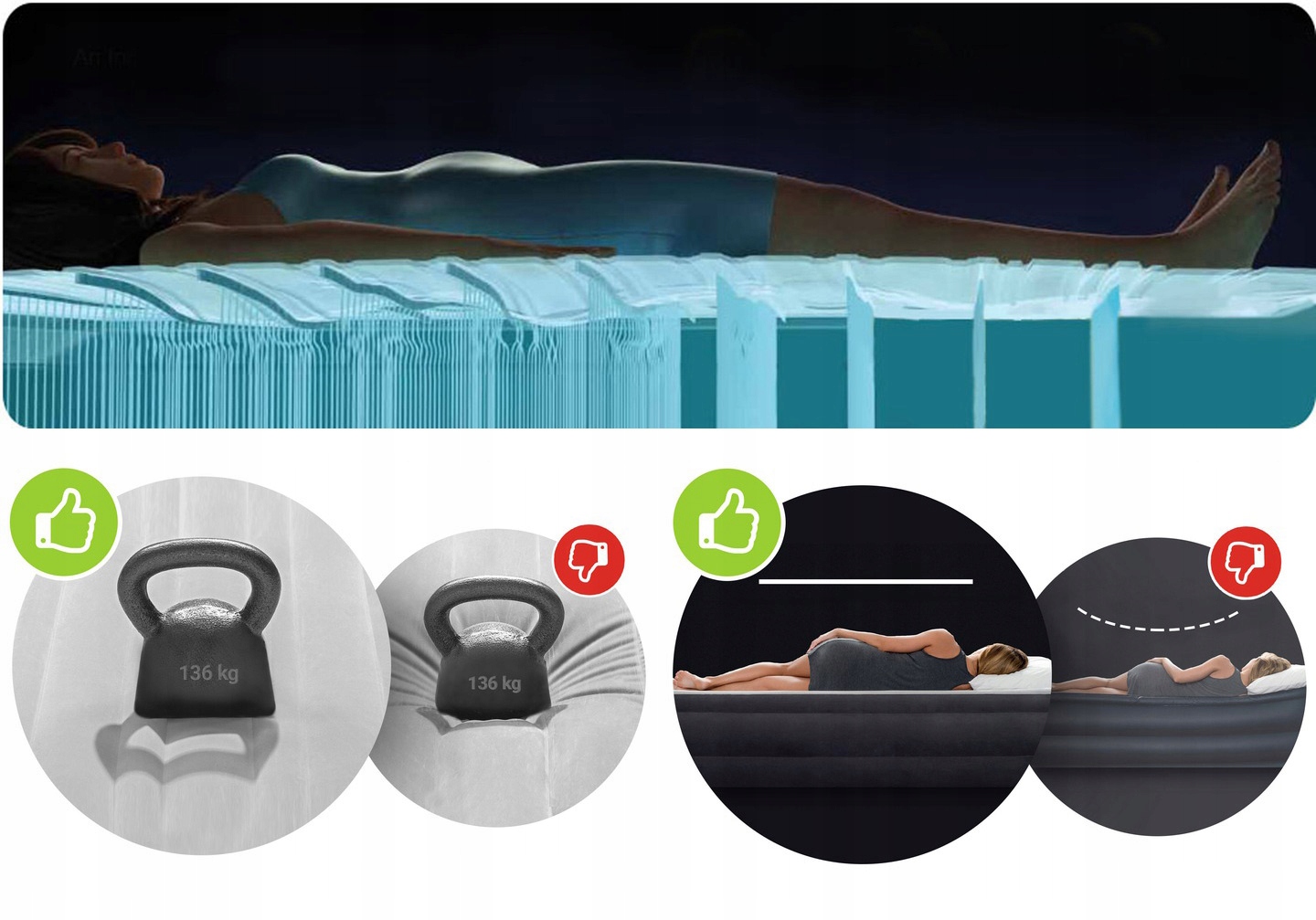 - В комплект входят: двуспальный матрас, 2 надувные подушки, поршневой насос, ремонтная заплатка.