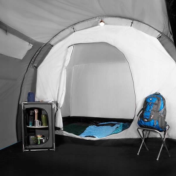 Конструкция палатки состоит из трех каркасов, изготовленных из стекловолокна, которые установлены в тропиках. Туннели и рамки отмечены одним цветом, поэтому вы легко сможете подобрать подходящую рамку к туннелю. Благодаря специальным ручкам внутри тента устанавливается отдельная спальня. Вся палатка, включая стропы крепления тента, крепится на штифты.