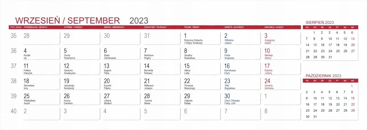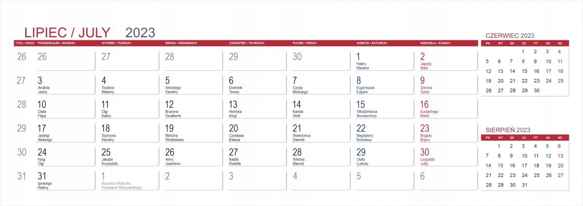 Очистить 12-страничный календарь. Четкий макет месяца с местом для заметки рядом с каждым днем, нумерацией недель и нерабочими днями, отмеченными в Польше красным. Дополнительно на каждой карточке вы найдете предварительный просмотр предыдущего и следующего месяца года с декабря 2022 по январь 2024 года. В календаре отмечены именины и праздники. Названия месяцев и дней недели в основном календаре также даны на английском языке.