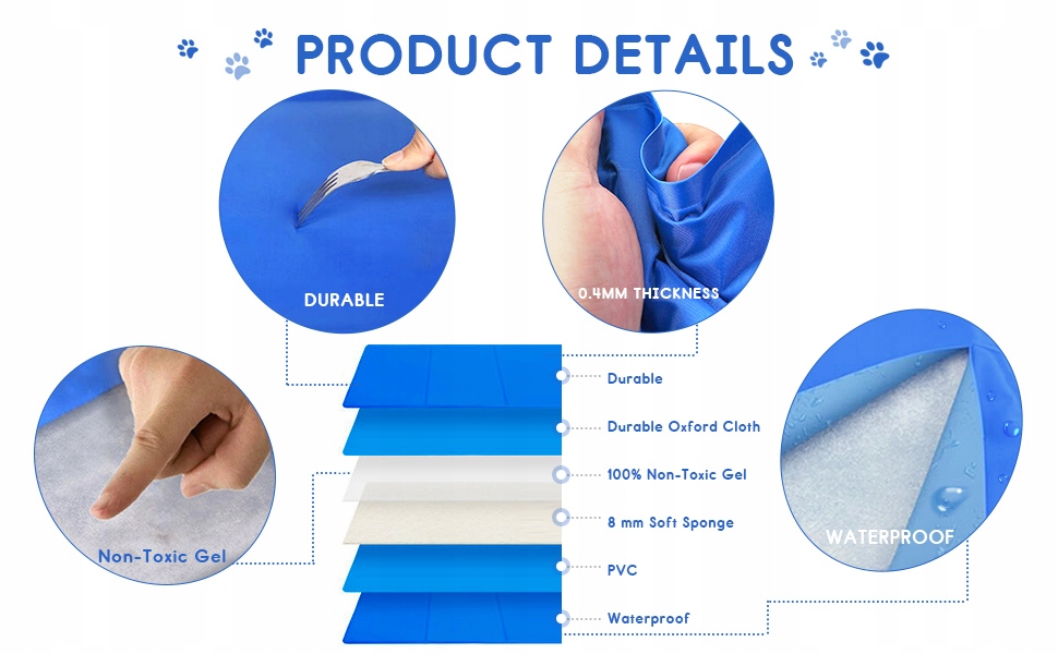 Высококачественный композитный ПВХ 300D Oxford - толщина 0,4 мм. Водонепроницаемый, устойчивый к царапинам, износостойкий и более прочный! 100% нетоксичный гель, безопасный как для человека, так и для домашних животных! Сильно надавите на край коврика 2 раза, убедитесь, что он не протекает. Гораздо толще и лучше, чем большинство других охлаждающих ковриков на рынке.