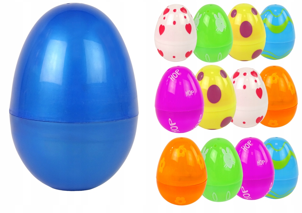 В одном большом яйце содержится до 12 пластиковых яиц разных цветов и узоров, в том числе: сердечки или кролики. Однако внутри они пусты и легко открываются. Они могут быть красивым украшением или развлечением. Внутри можно спрятать небольшой подарок в виде фигурки или сладости. Задача малыша будет найти спрятанное пасхальное яйцо и собрать призы. И тот, кто найдет больше, станет победителем.