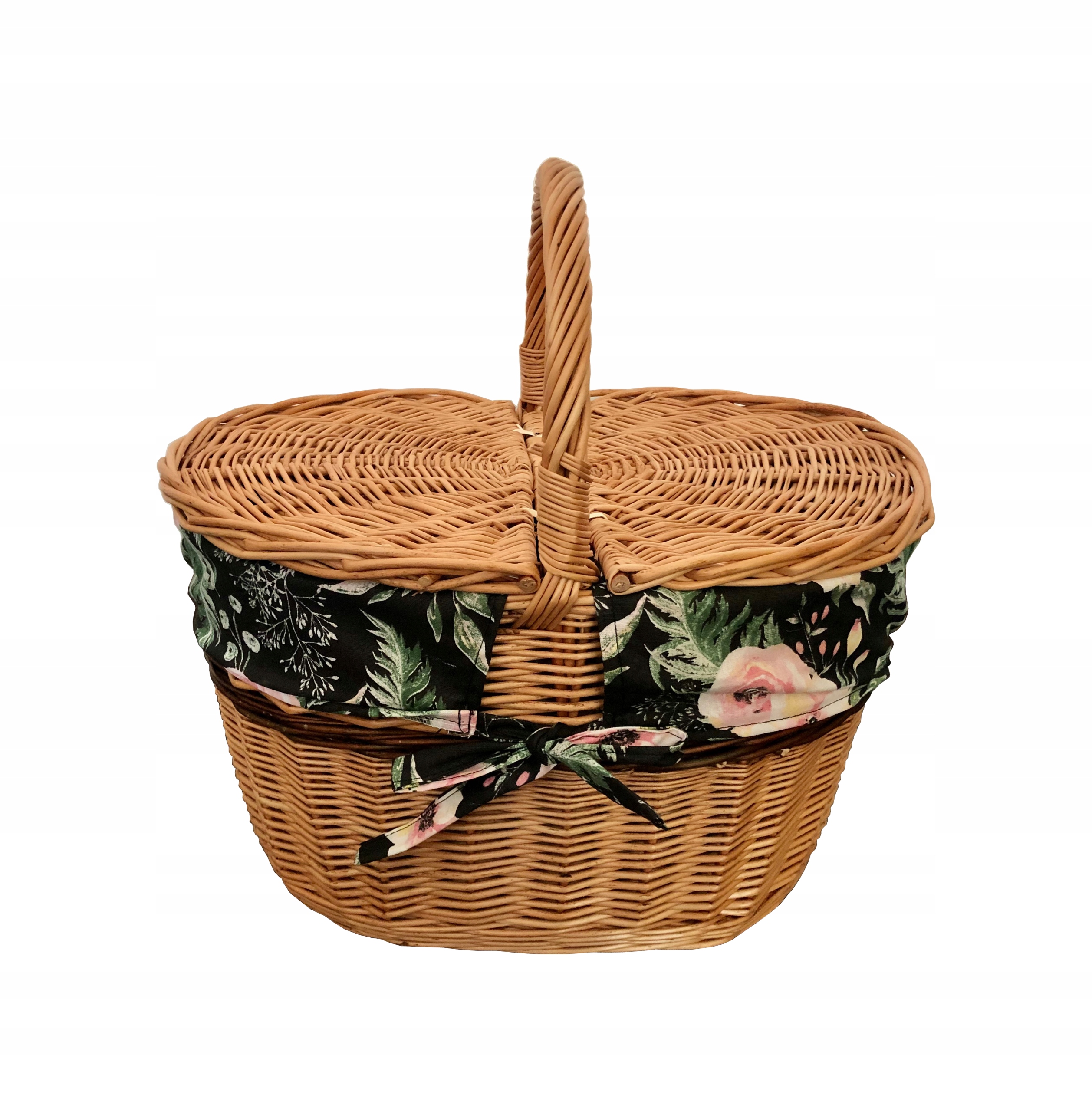 Плетеная корзина для пикника с красивой цветочной вставкой.
