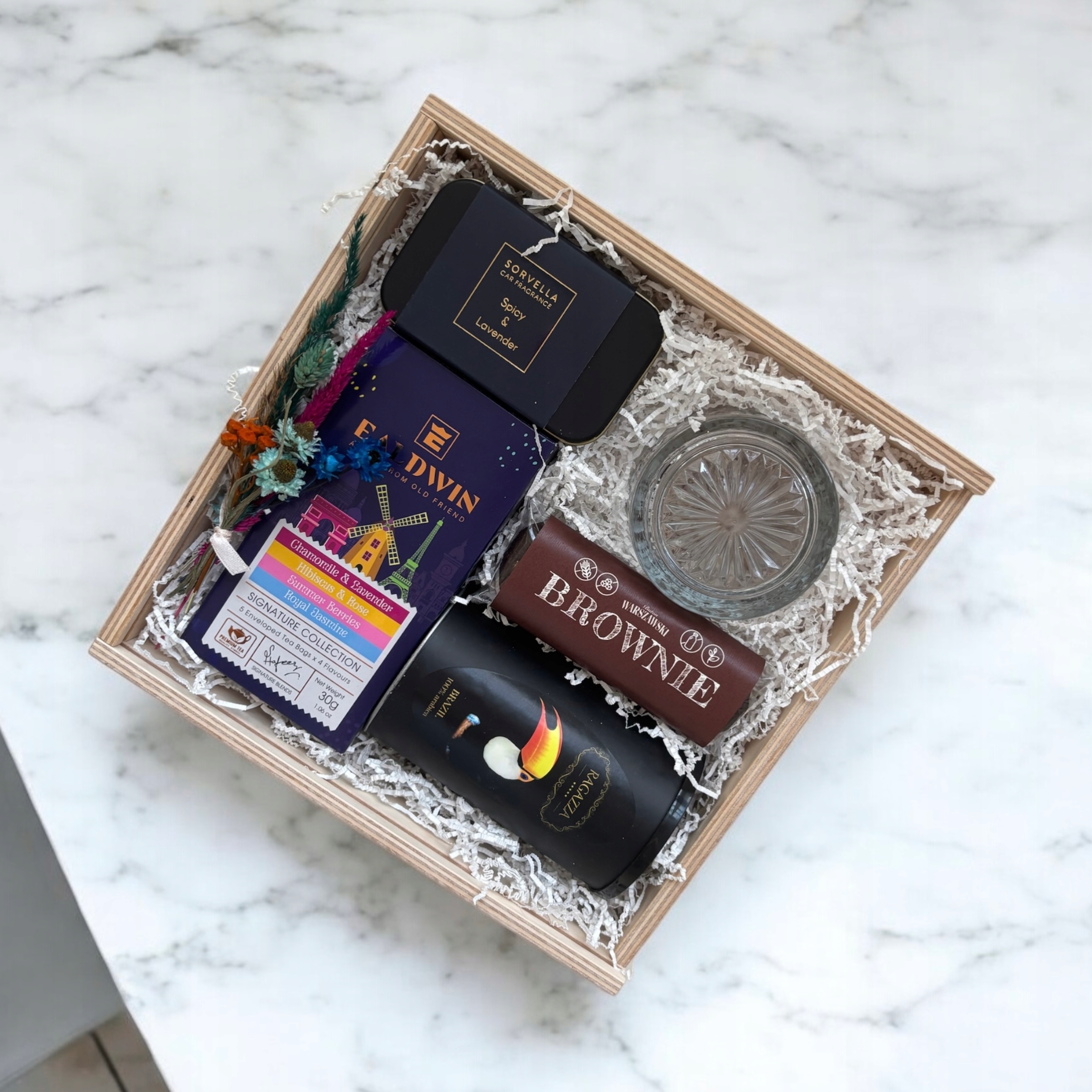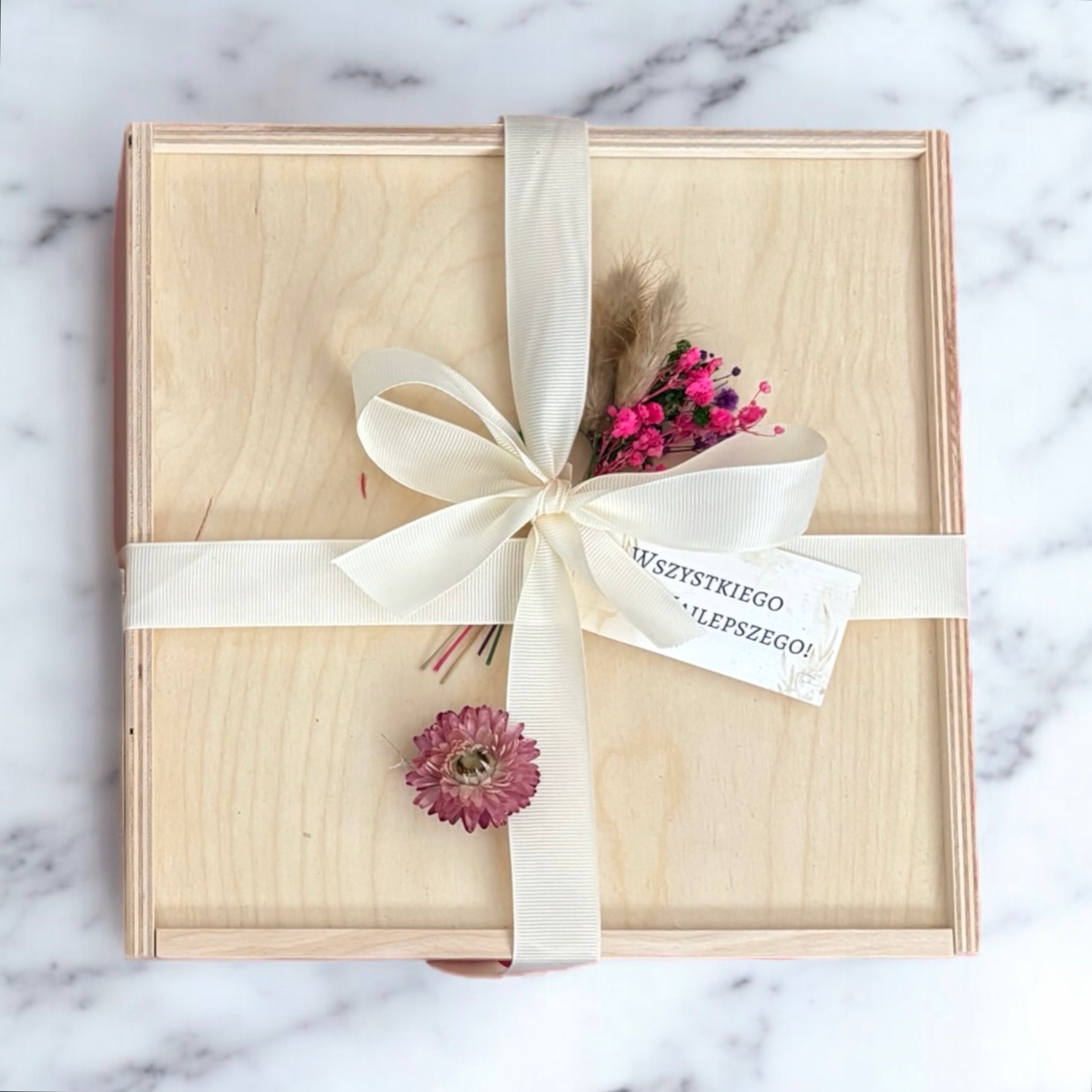 - Деревянная премиальная коробка с размерами 25x25 см, экологическое наполнение, декоративные аксессуары, такие как высушенные цветы, которые подчеркивают натуральный характер набора