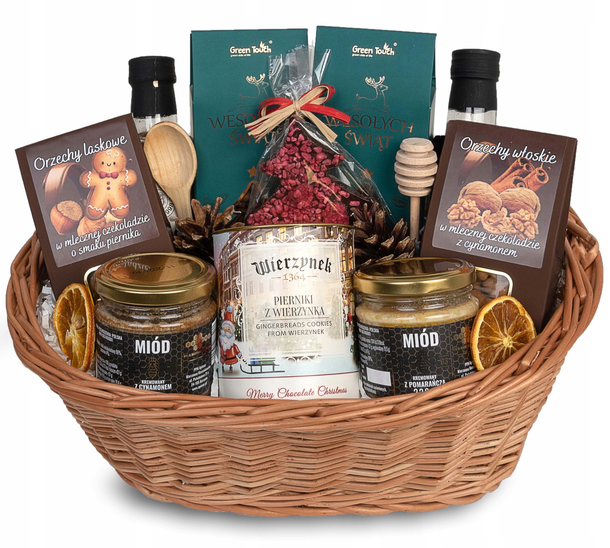 Позвольте себе погрузиться в волшебство Рождества благодаря богатому набору избранных товаров, включенных в нашу корзину. Откройте для себя гармонию вкусов благодаря идеальному сочетанию черного чая, ароматного кофе «Альпийские пряники» и изысканных сиропов. Побалуйте себя такими сладостями, как имбирные пряники, орехи в шоколаде и уникальные медовые деликатесы. Все это упаковано в солидную польскую плетеную корзину, дополненную рождественскими украшениями. Подарите своим близким рождественское настроение одним подарком!