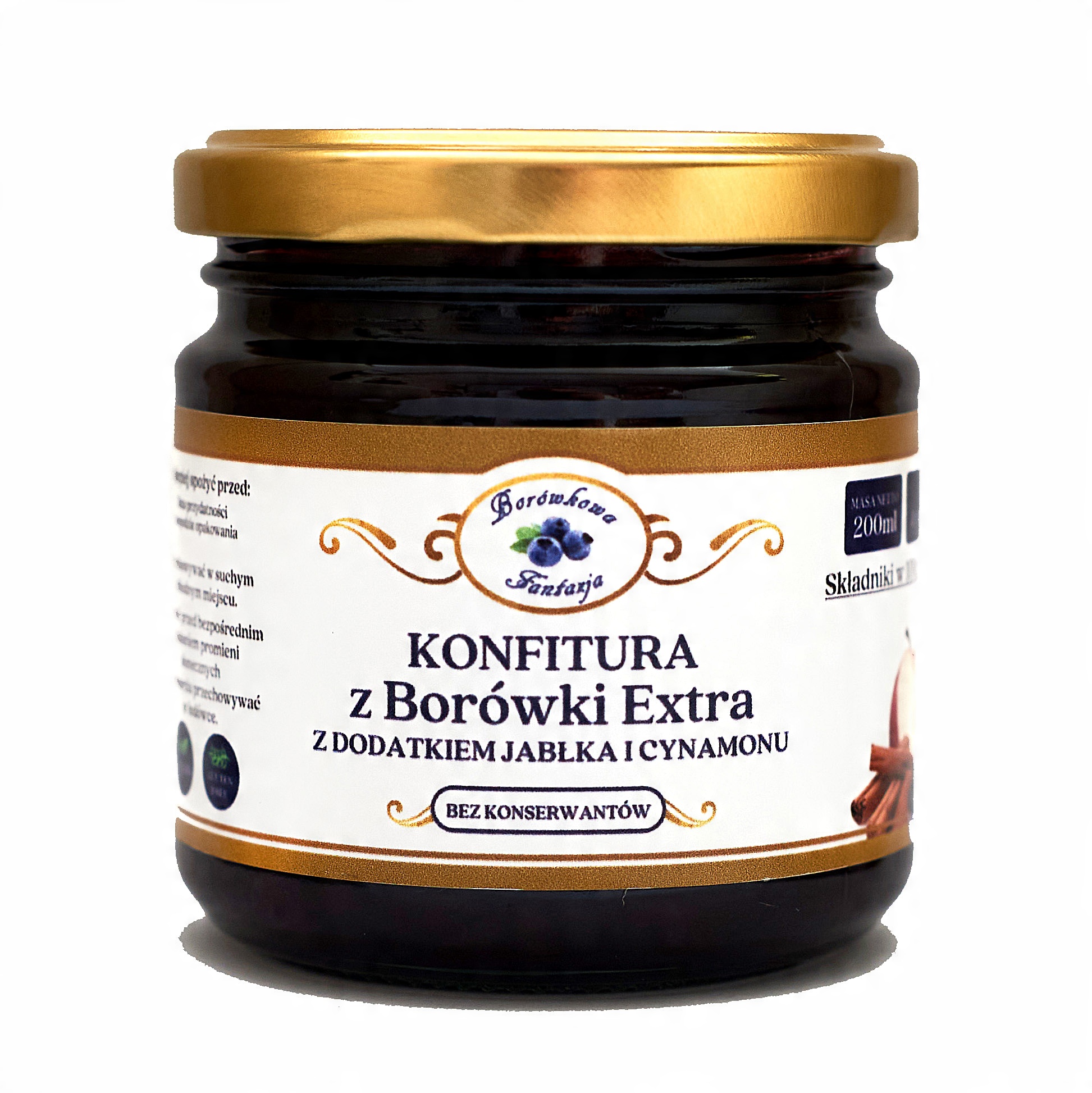 - Джем Экстра Черничный с Яблоком и Корицей 200мл. - (100 г готового продукта высшего качества приготовлены из 115 г черники и 10 г яблок)