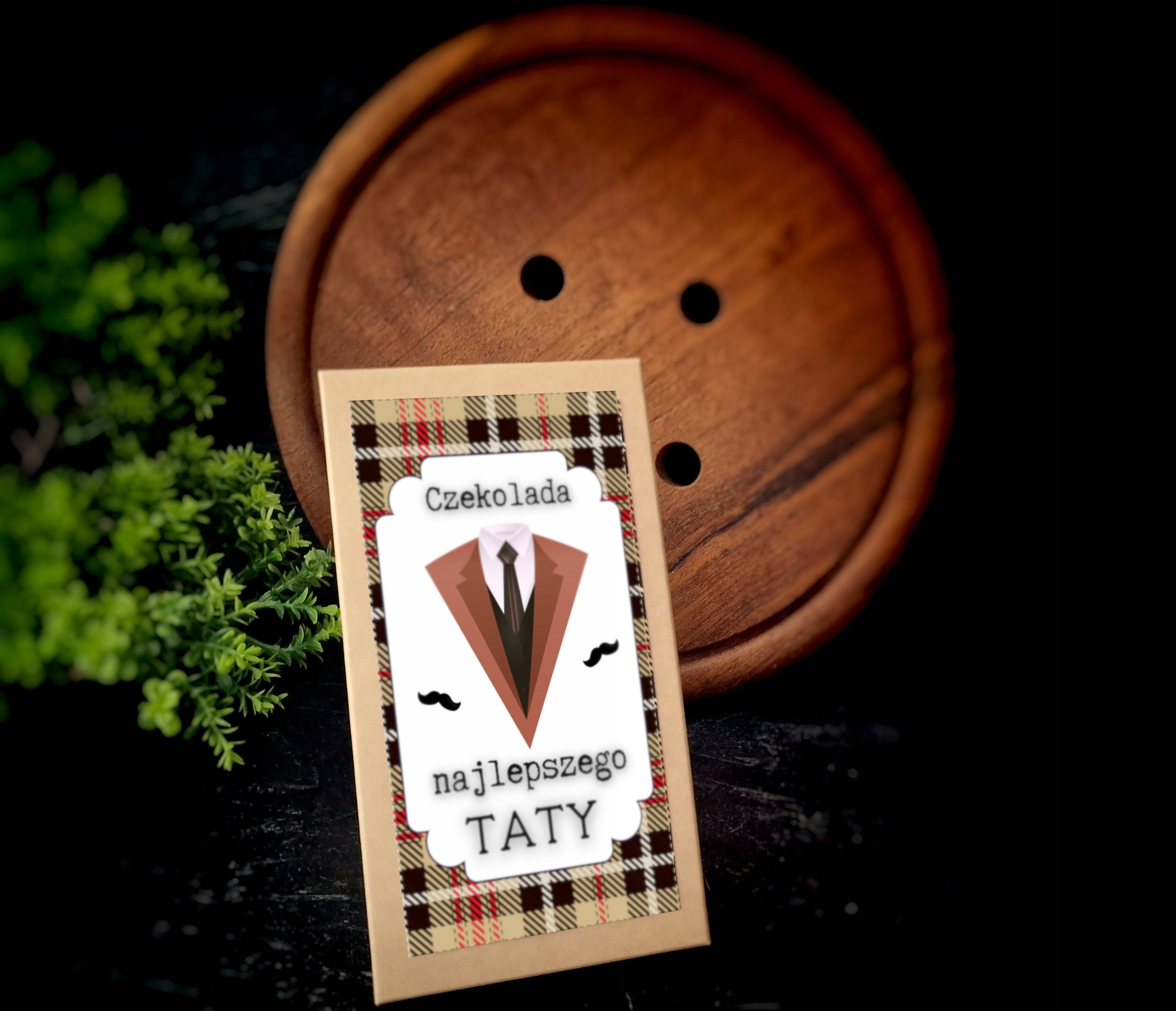 - Шоколад, расположенный в экологическую картонную коробку, украшенную меток для папы - Сладкостью (Wedel, Wawel, Schogetten или Milka). Элегантный подарок с экологической начинкой, украшенный на улице с карточкой для папы, внутри деревянных усов и шоколада Розето