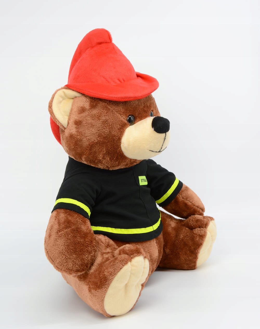 Большой плюшевый мишка-пожарный-талисман в сидячем положении. Идеальный подарок для ребенка, мечтающего стать пожарным, и обязательно вызовет улыбку взрослого! Отличный выбор если у вашего подразделения нет талисмана!